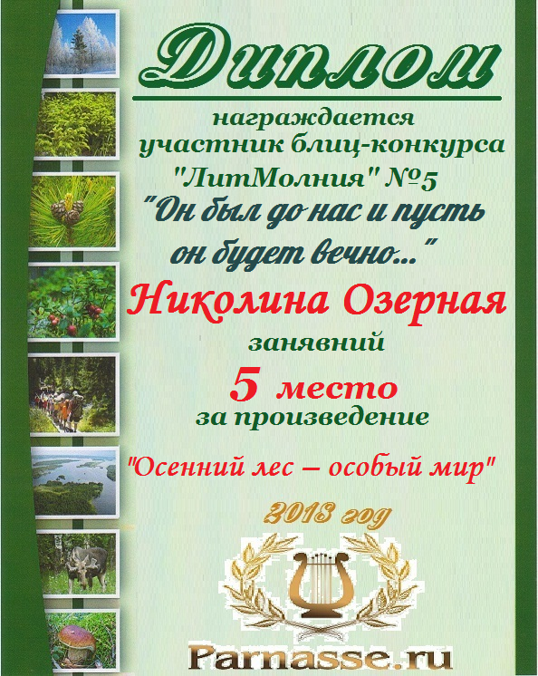 Пятое место в Блиц-Конкурсе "ЛитМолния" №5 «Он был до нас и пусть он будет вечно…» за произведение «Осенний лес – особый мир». Поздравляем!