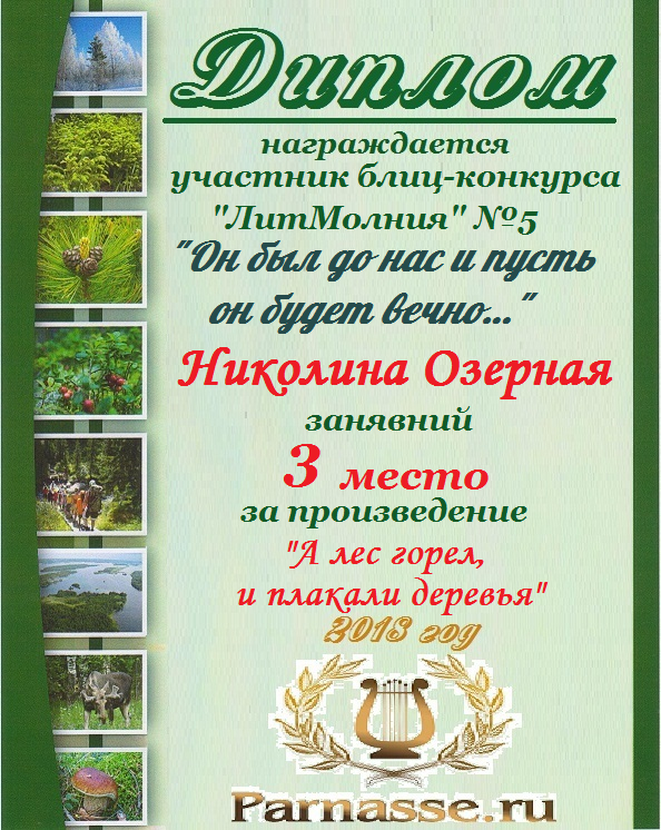 Третье место в Блиц-Конкурсе "ЛитМолния" №5 «Он был до нас и пусть он будет вечно…» за произведение «А лес горел, и плакали деревья» . Поздравляем!