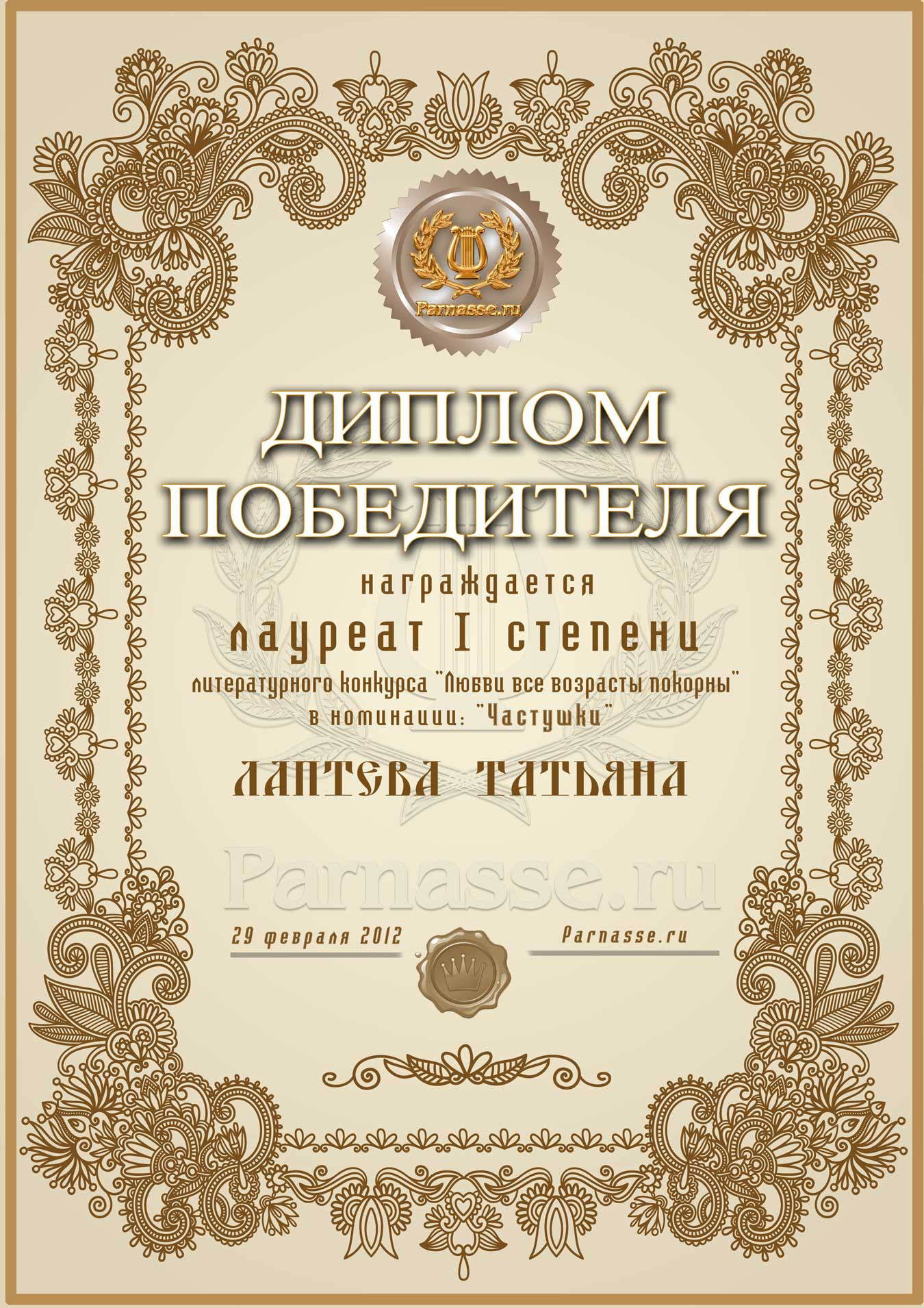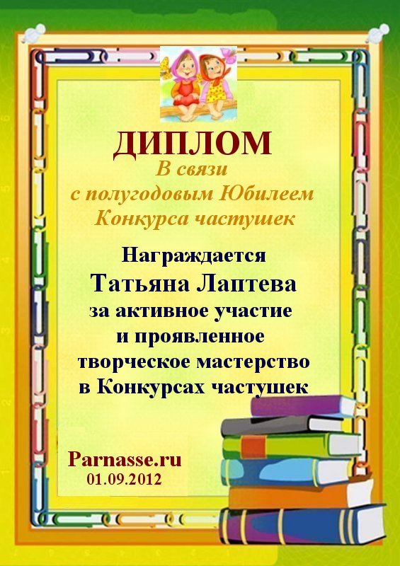 Первое место в праздничном конкурсе "Поздравим Парнас вместе!", в номинации "Лучшая поздравительная песнь Парнасу". Автор слов "Частушки про сайт "Парнас". Мы рады Вашему участию, Татьяна, в красивом конкурсе и счастливы поздравить Вас с нашим общим 3-х летним Юбилеем! Пусть удача никогда не покидает Вас, счастья Вам, крепкого здоровья и самых высоких творческих успехов! Спасибо!