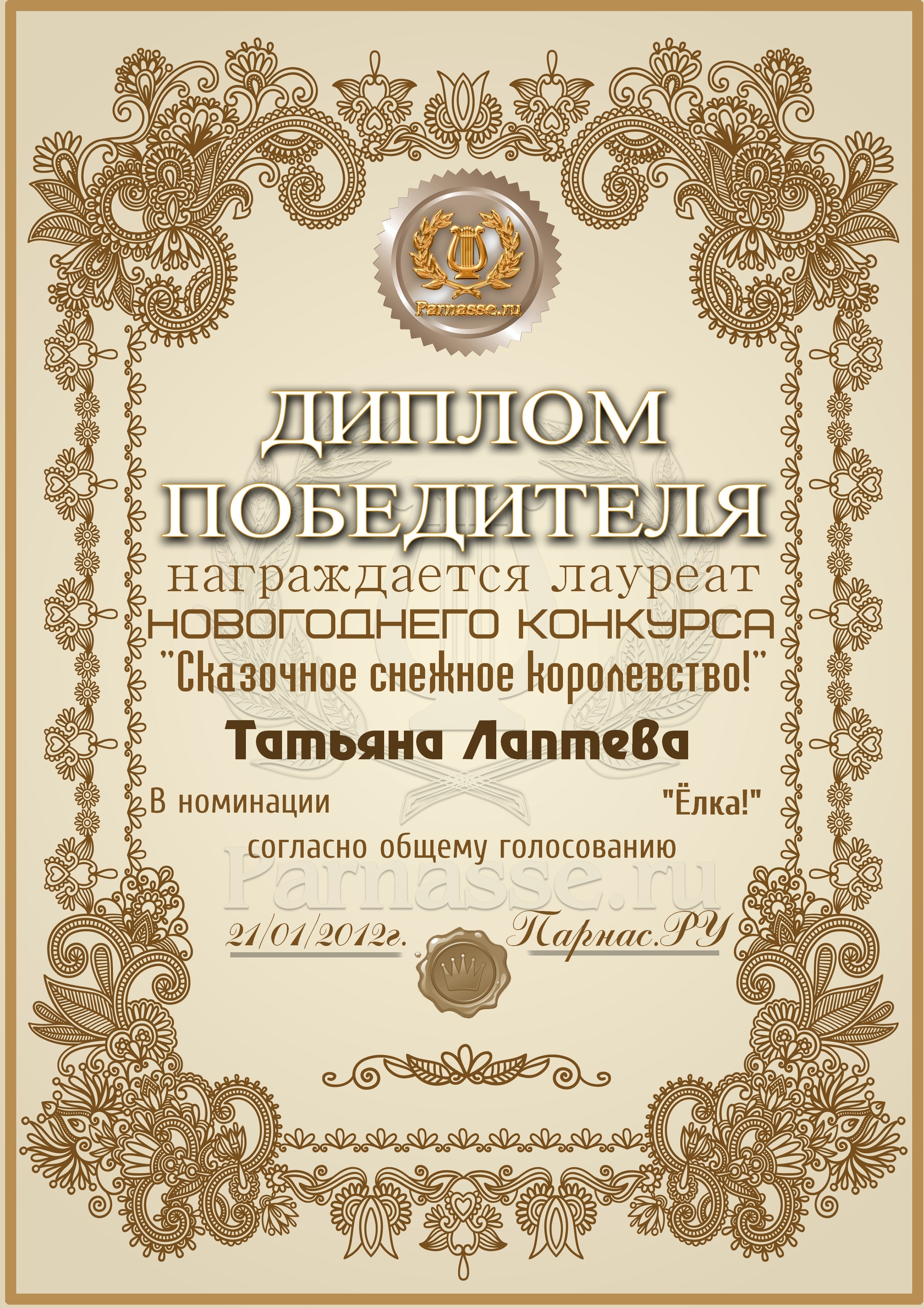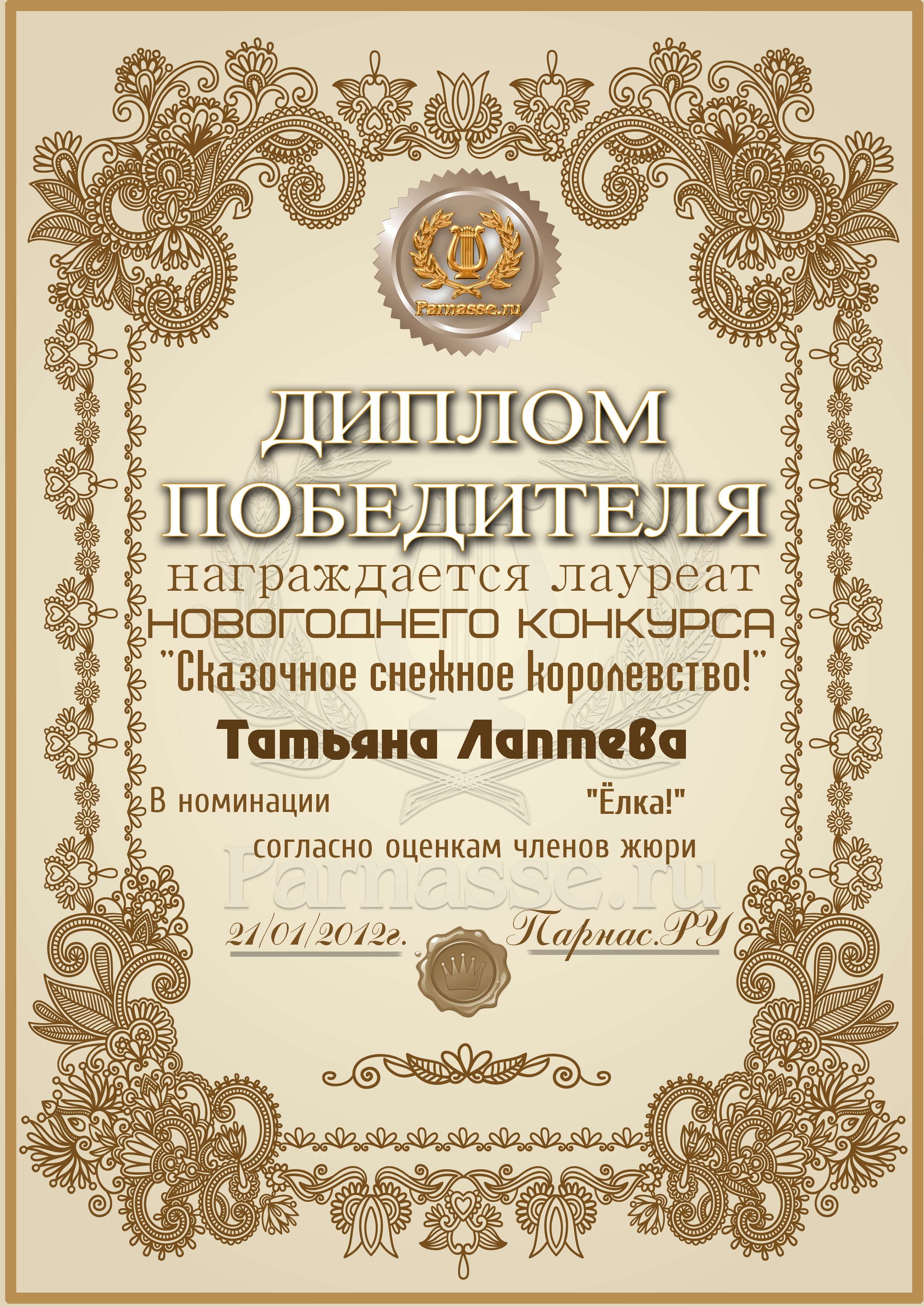 ПЕРВОЕ место в музыкально-литературном конкурсе «Зимняя сказка», в номинации «Зима и Любовь»! Произведение «Не морозь зима любимого»! Поздравляем с блестящей победой в конкурсе, Татьяна!