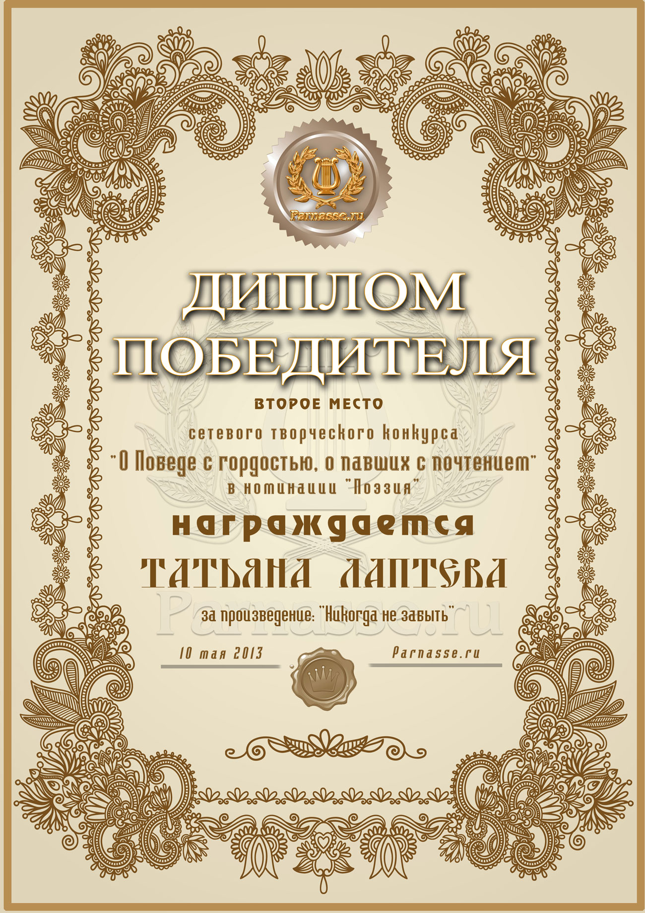 Второе место в музыкально-литературном конкурсе «О Победе с гордостью, о павших – с почтением!» Номинация в поэзии «Ваш Подвиг бессмертен»! Произведение «Никогда не забыть»! Поздравляем с заслуженной великолепной победой!