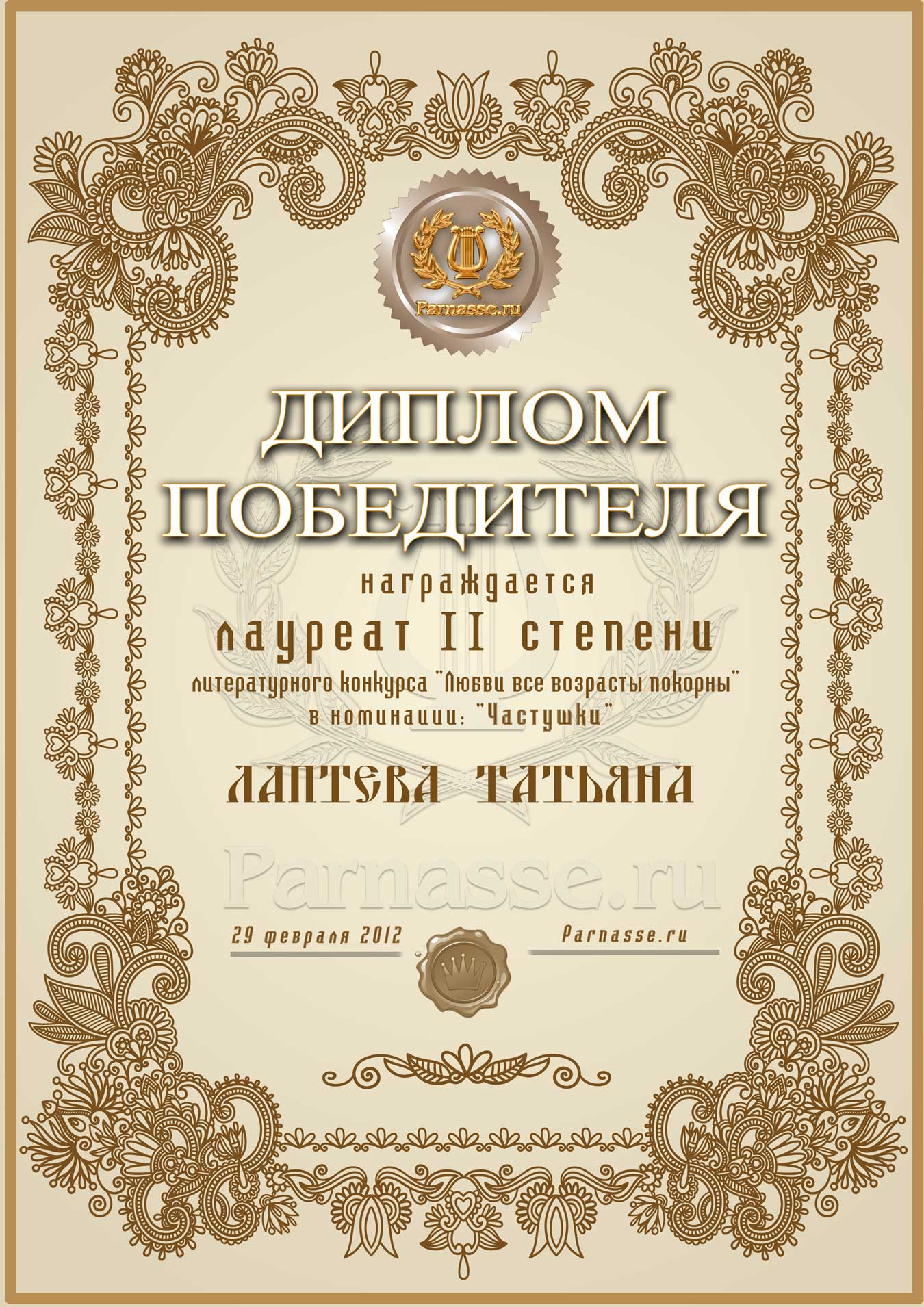 Диплом лауреата II степени сетевого лит. конкурса "Любви все возрасты покорны" в номинации "Частушки", (Общее голосование).