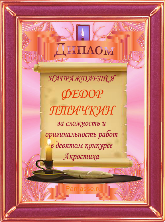 Диплом в дополнительной номинации за "Сложность и оригинальность" в 9 конкурсе АКРОСТИХА! ПОЗДРАВЛЯЮ!