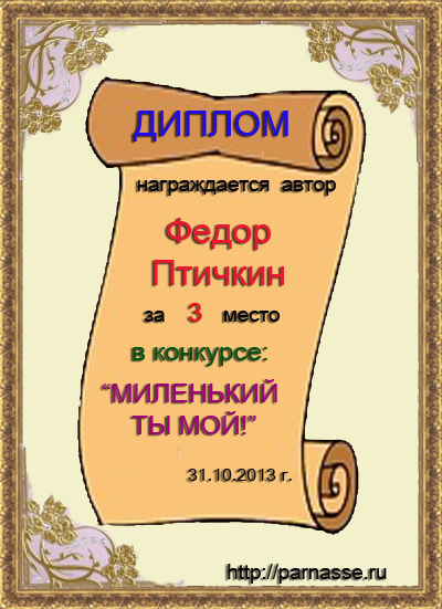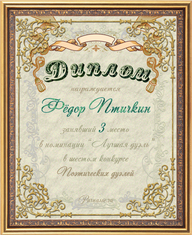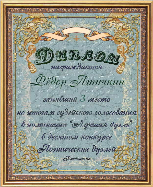 Диплом за 3-е место в номинации "Лучшая дуэль" по итогам судейского голосования в десятом конкурсе поэтических дуэлей(№ 9.2)