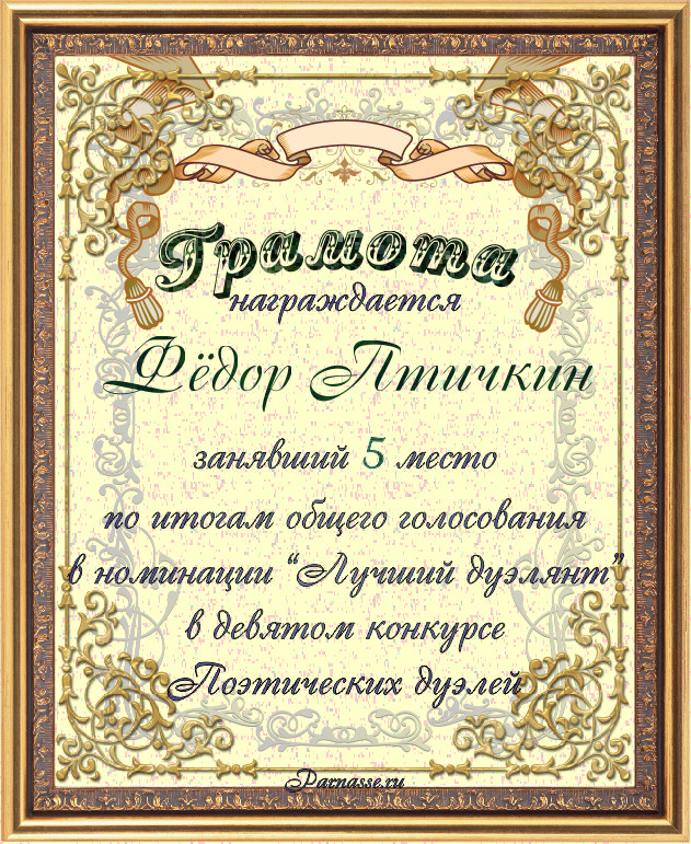 Грамота за 5-е место в номинации "Лучший дуэлянт" по итогам общего голосования в девятом конкурсе поэтических дуэлей