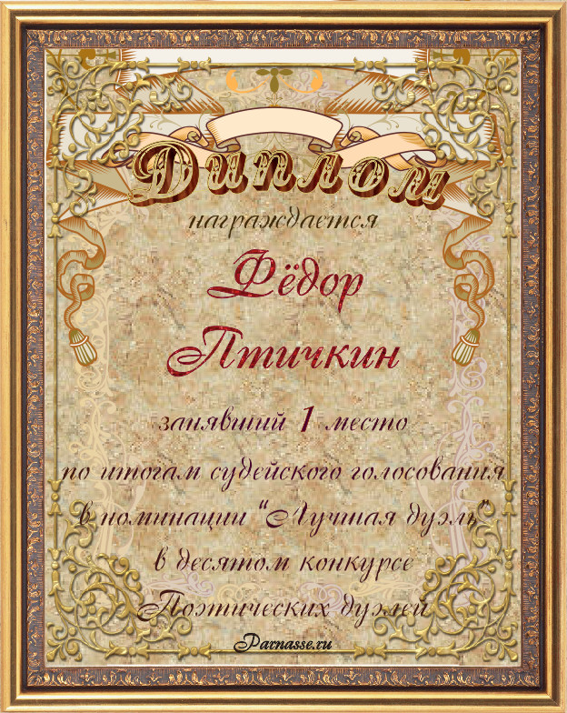 Диплом за 1-е место в номинации "Лучшая дуэль" по итогам судейского голосования в десятом конкурсе поэтических дуэлей (№ 17.4)