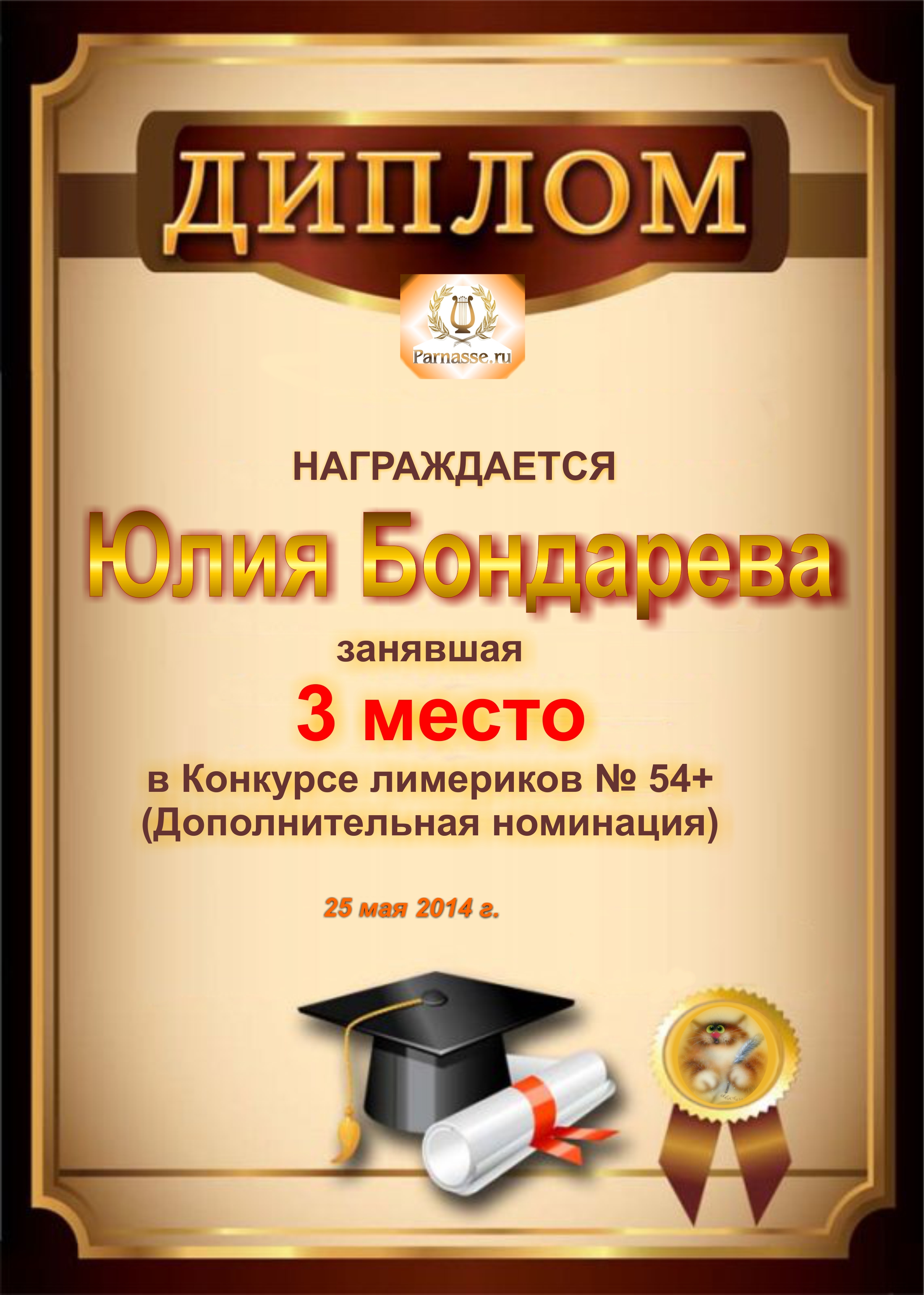 Диплом за победу и 3 место в дополнительной номинации конкурса лимериков № 54+ (25.05.2014г.)