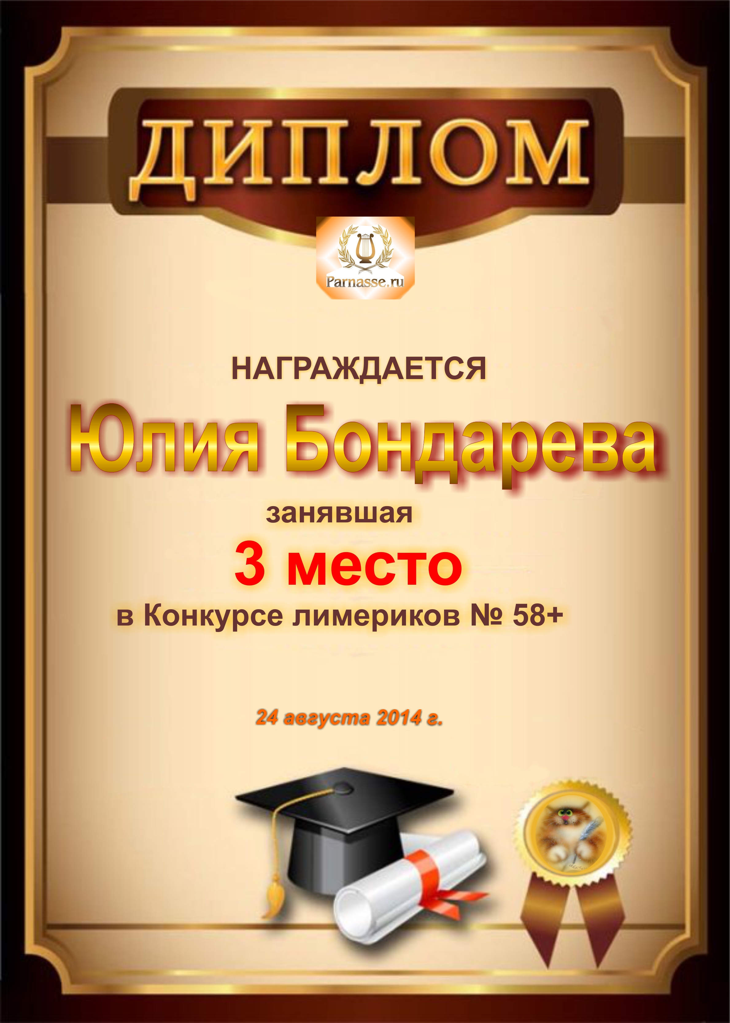 Диплом за победу и 3 место в конкурсе лимериков № 58+ (24.08.2014 г.)