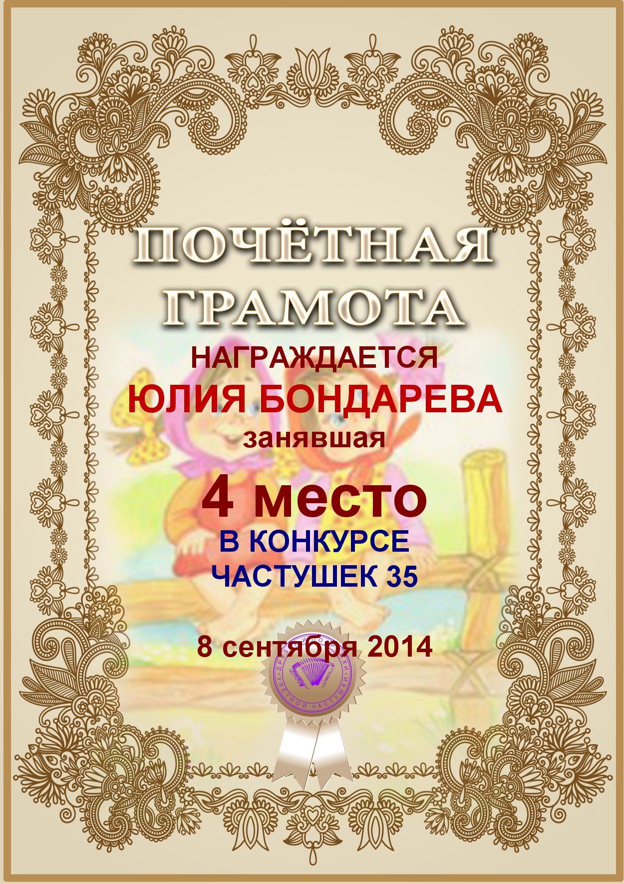 Похвальная грамота за 4 место и активное участие в конкурсе лимериков № 57+ (27.07.2014 г.)