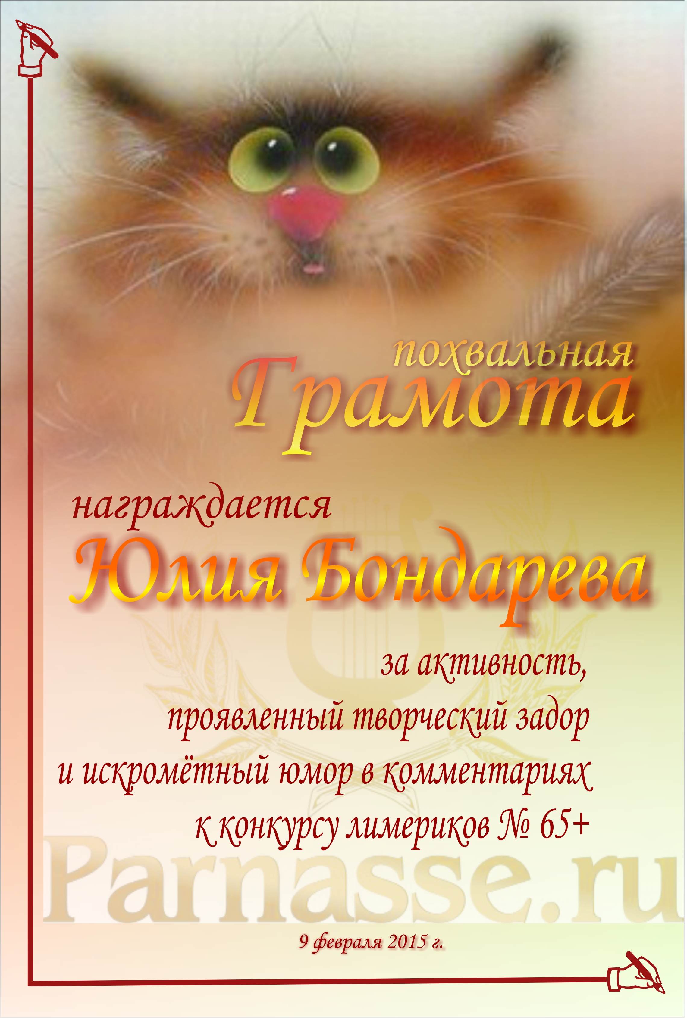 Похвальная грамота за активность в комментариях к конкурсу лимериков № 65+ (9.02.2015 г.)