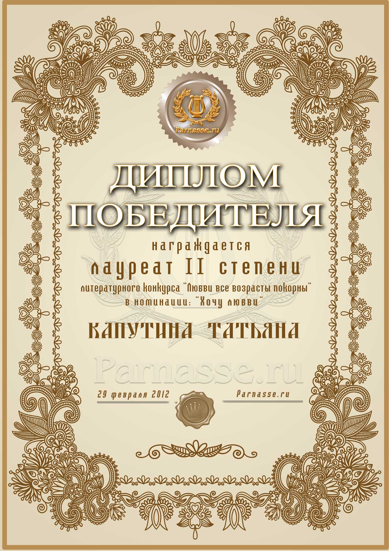Диплом лауреата II степени сетевого лит. конкурса "Любви все возрасты покорны" в номинации "Хочу любви", (Редакторское голосование).