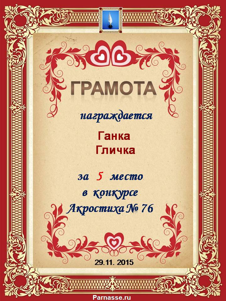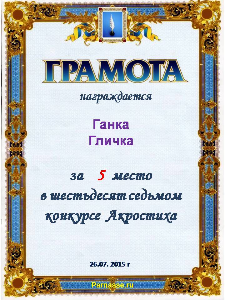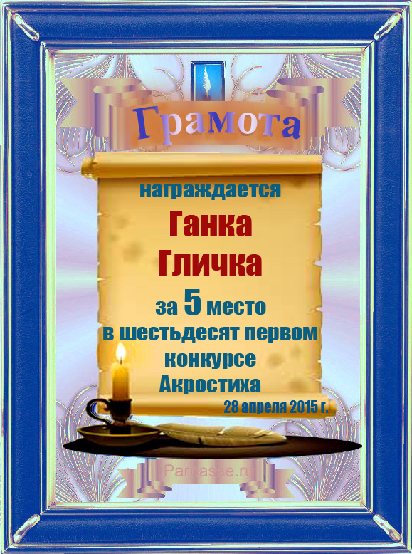 Грамота за 5 место в 106 конкурсе АКРОСТИХА (Альтернатива)! ПОЗДРАВЛЯЮ!