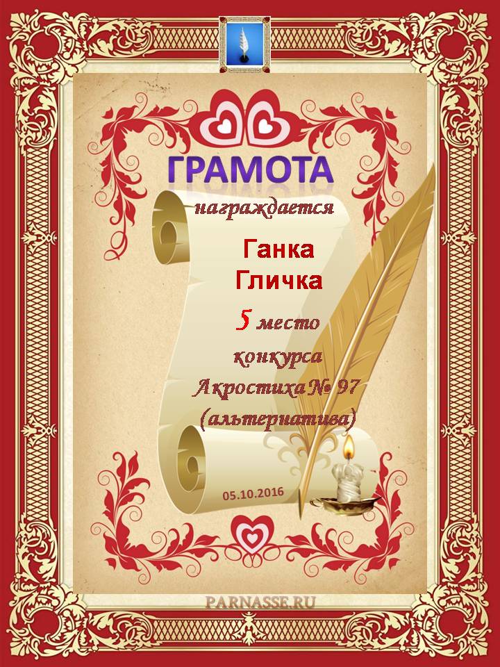 Грамота за 5 место в 97 конкурсе АКРОСТИХА (Альтернатива)! ПОЗДРАВЛЯЮ!