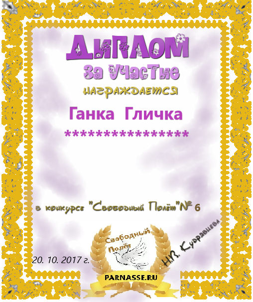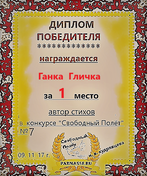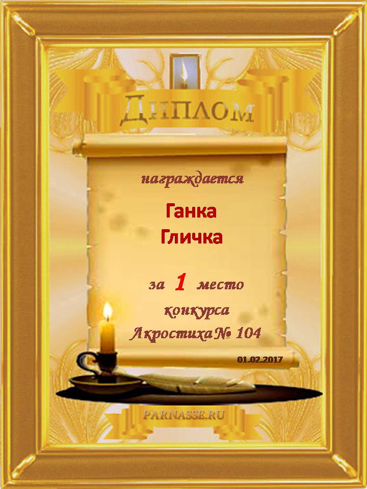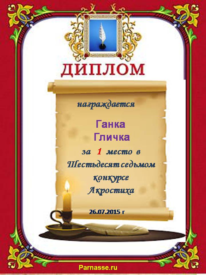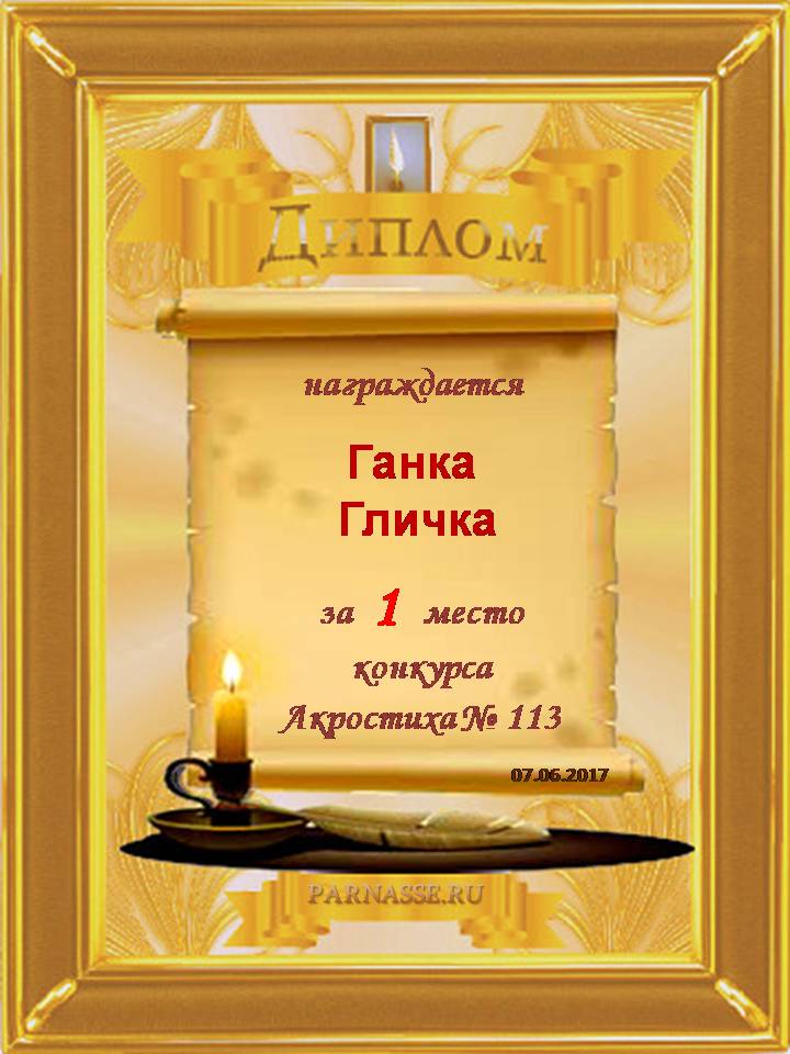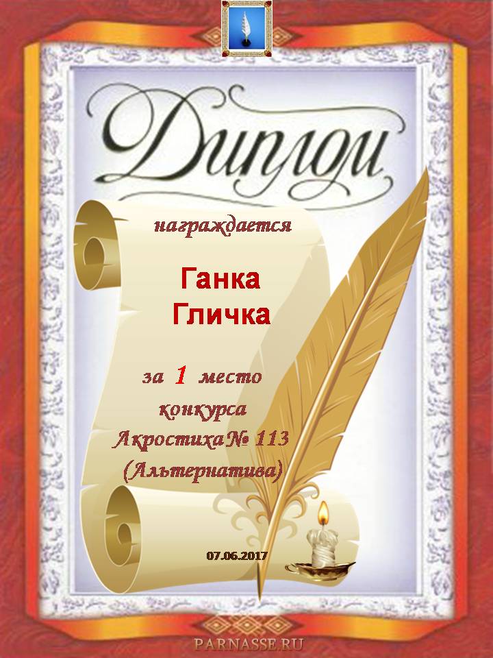 Диплом за 1 место в 113 конкурсе АКРОСТИХА (Альтернатива)! ПОЗДРАВЛЯЮ!