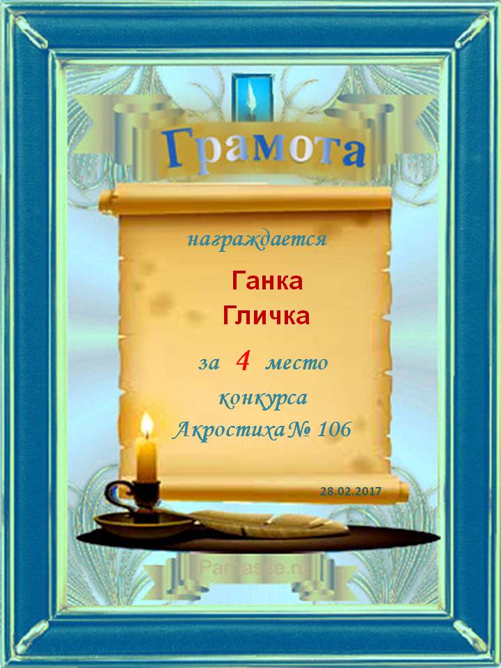Грамота за 4 место в 108 конкурсе АКРОСТИХА (Альтернатива)! ПОЗДРАВЛЯЮ!