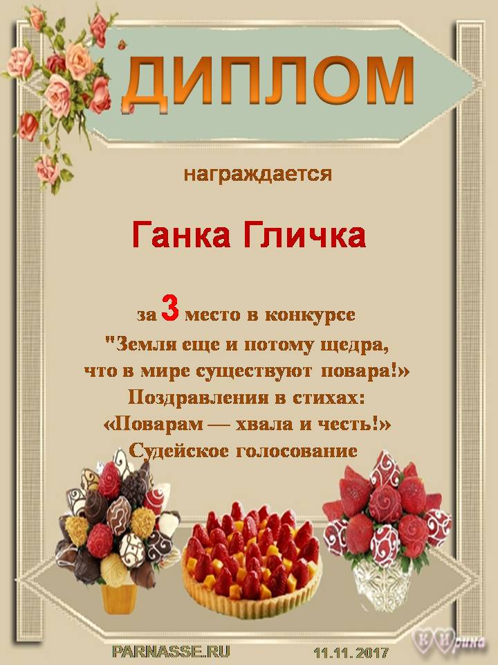 Поздравляем с 3 местом! Номинация: Поздравления в стихах: Поварам честь и хвала! - судейское голосование.