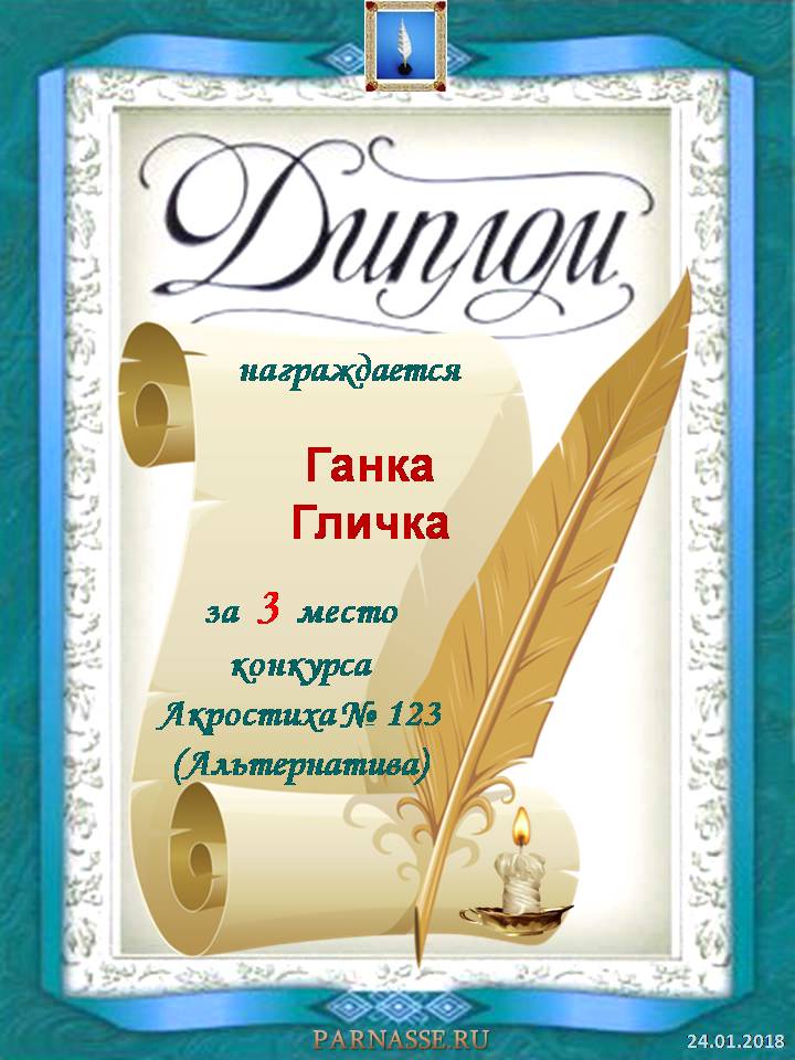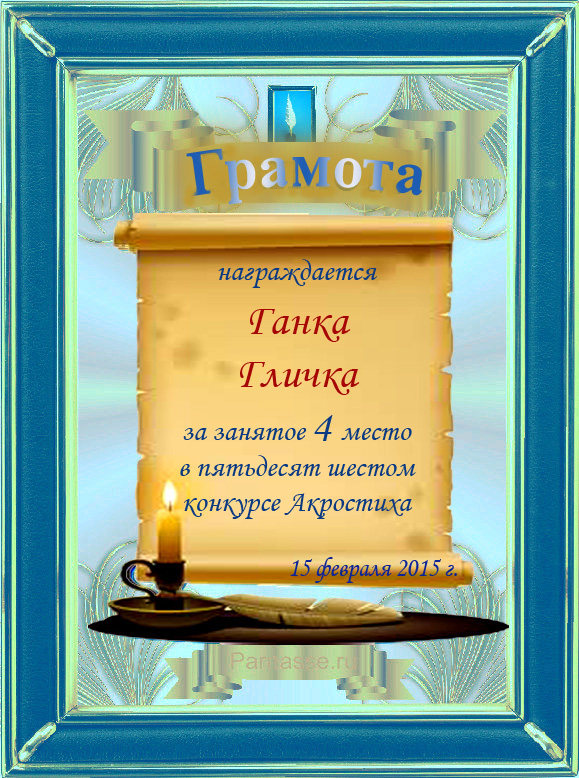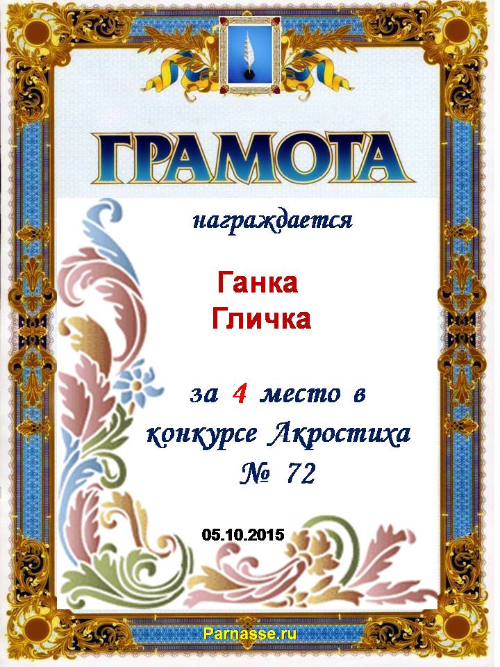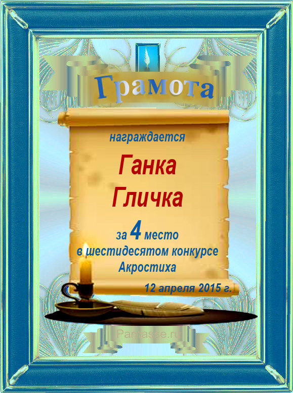 Грамота за 4 место в 118 конкурсе АКРОСТИХА (Альтернатива)! ПОЗДРАВЛЯЮ!