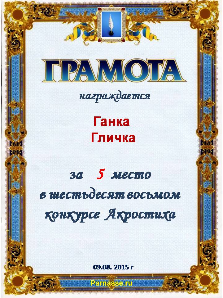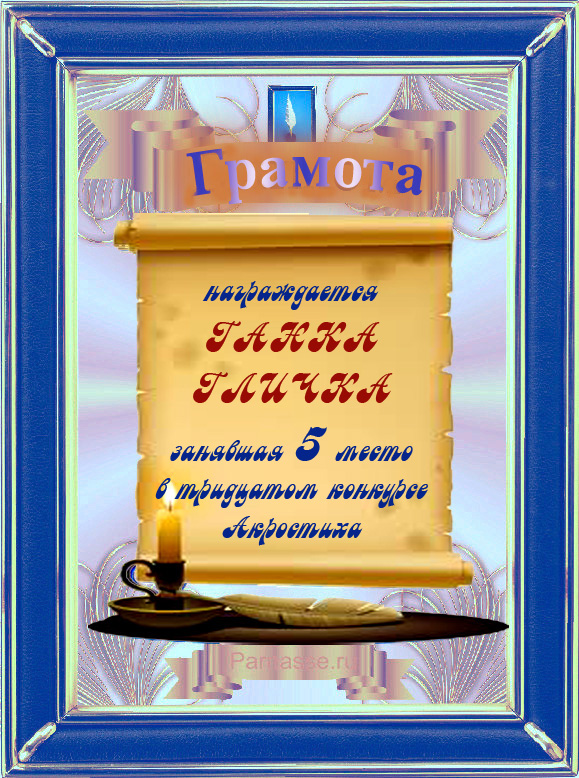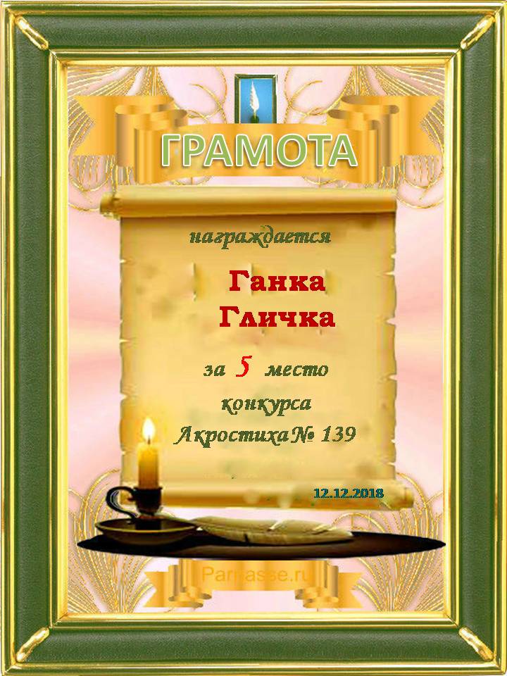 Грамота за 5 место в 140 конкурсе АКРОСТИХА (Альтернатива)! ПОЗДРАВЛЯЮ!