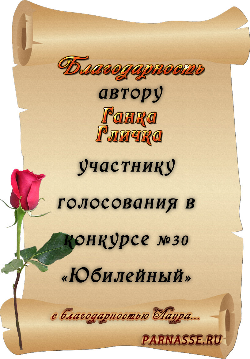 Позвольте Вас от всей души поблагодарить за участие в юбилейном конкурсе, за великолепные поздравления и пожелания нашему "Парнасу", разменявшему уже третий год – серьезный возраст по мерам Интернета! Очень признательны за Ваши прекрасные слова, желаем Вам всех-всех благ в будущем и новых высот в творчестве! Спасибо!