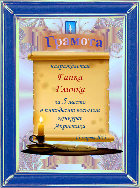 Грамота за 5 место в 138 конкурсе АКРОСТИХА (Альтернатива)! ПОЗДРАВЛЯЮ!