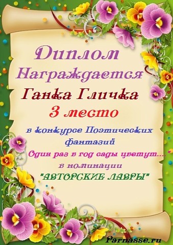 Номинация "Лучшая поздравительная песнь Парнасу". Разрешите Вас поблагодарить за великолепные, преисполненные тепла и добра песни, адресованные в эту замечательную дату нашему любимому сайту. Три года – это не срок, но дата! "Парнас" стал на ноги, но без таких авторов как Вы, это было бы невозможно! Спасибо Вам за все, будьте всегда жизнерадостны, любимы, добры и счастливы, а Ваше прекрасное творчество пусть регулярно радует наш слух и душу! Будьте здоровы!