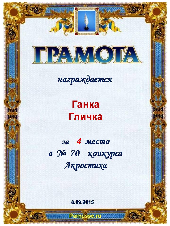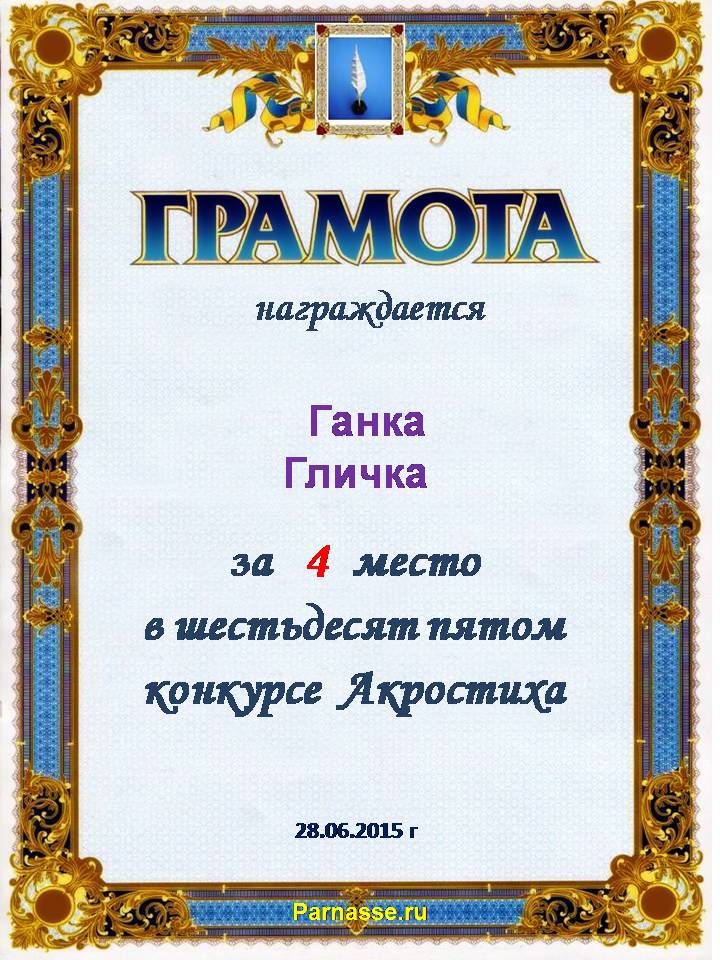 Грамота за 4 место в 103 конкурсе АКРОСТИХА (Альтернатива)! ПОЗДРАВЛЯЮ!
