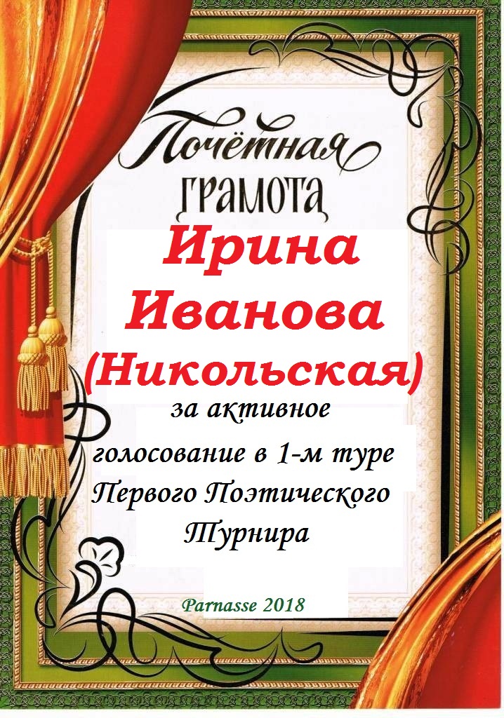 За активное участие в обсуждении конкурсных произведений 1-го тура Первого Поэтического Турнира "Говорите о любви, говорите". Спасибо за поддержку!