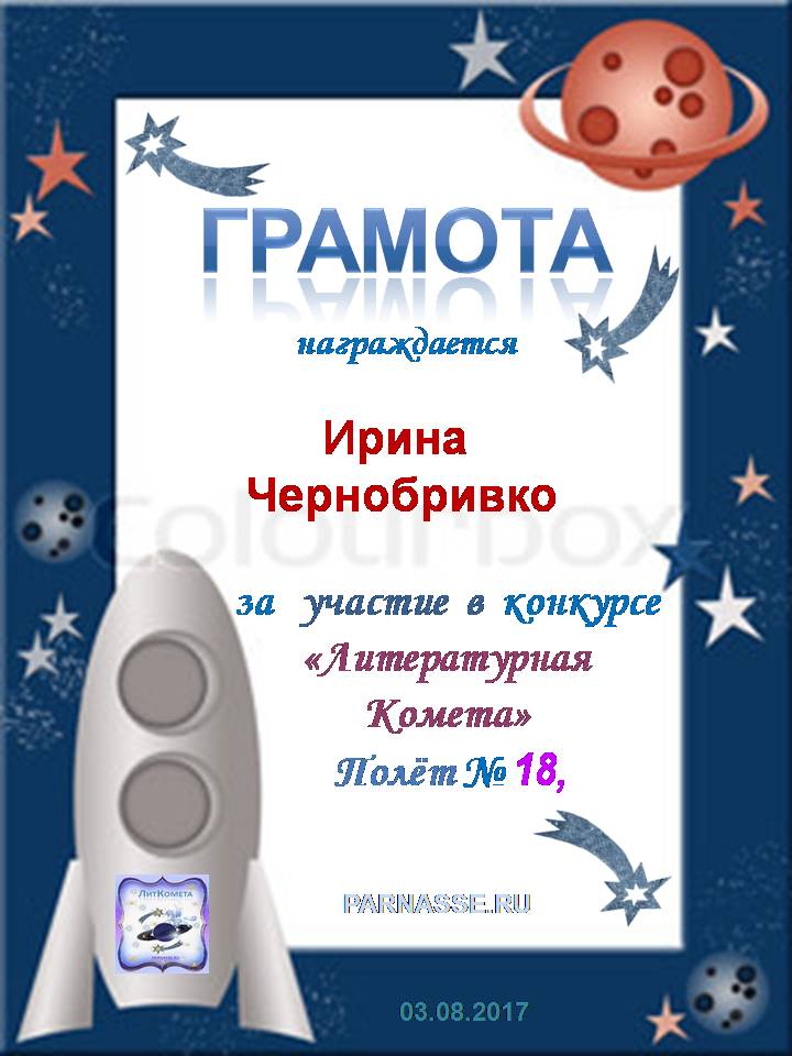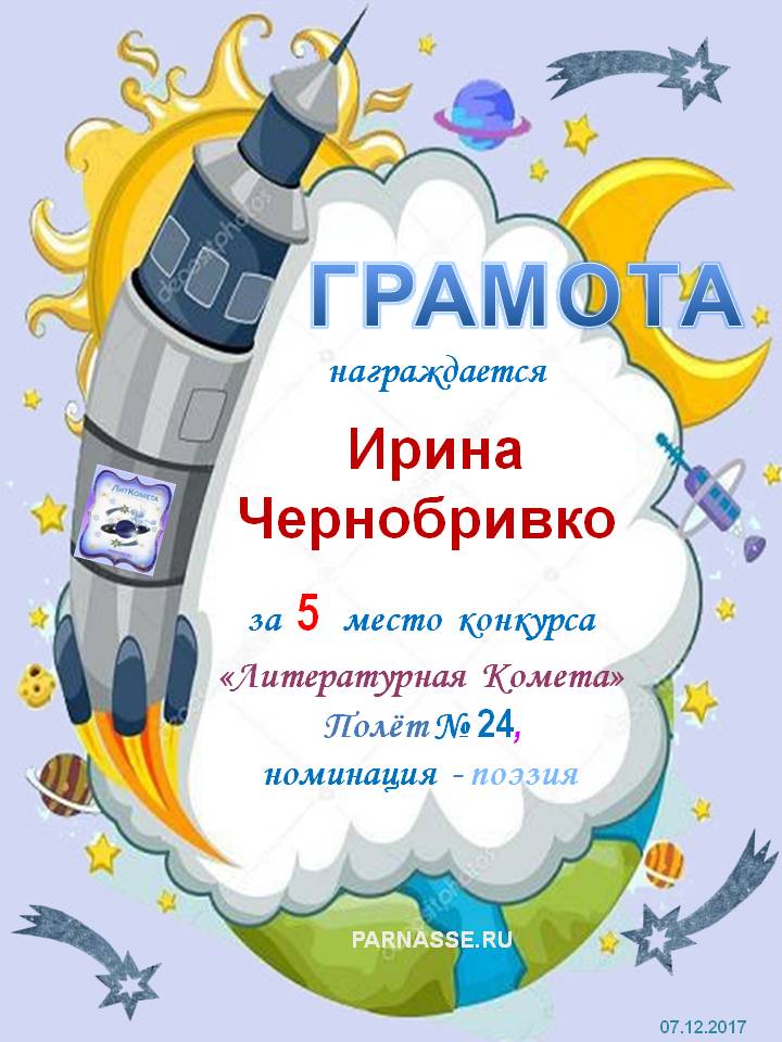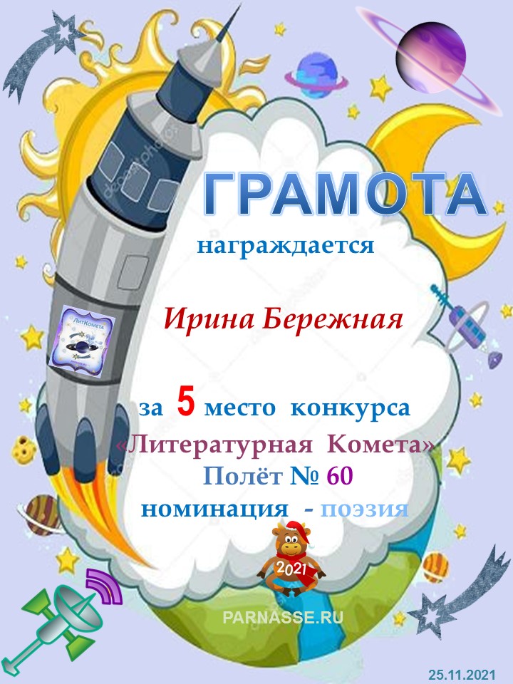 Поздравляю с занятым 3 местом в конкурсе “Литературная Комета – Полёт № 45» - Номинация Поэзия