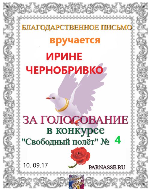 За участие в конкурсе "День птиц" в поэтической номинации "Эти великолепные птицы". Спасибо за великолепный конкурсный стих.