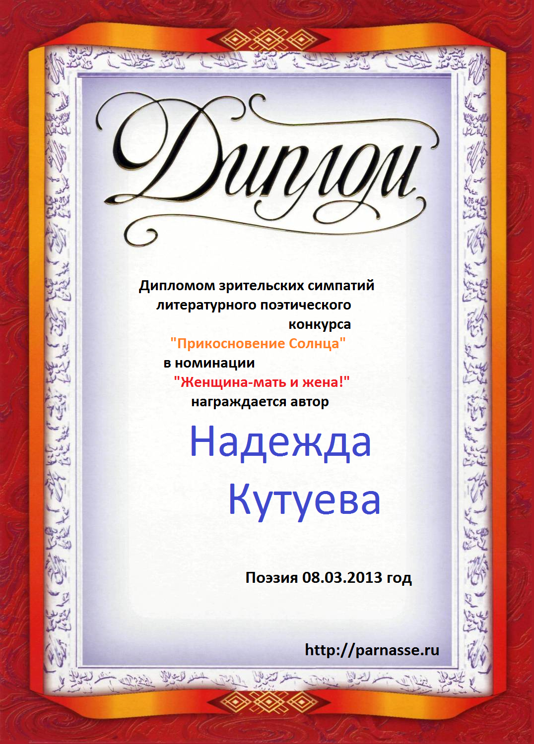 Песенная номинация "Поздравляем Мужчин с Днем Защитника Отечества", автор песни "Уже почти покорена..". Поздравляем с Победой в конкурсе, Надежда!