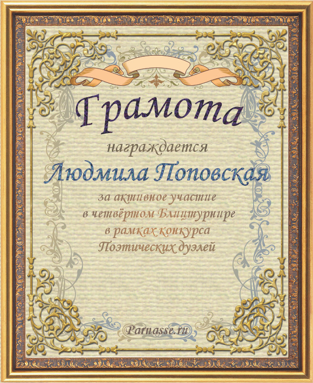 Диплом за второе место в номинации "Лучшая дуэль" в четвёртом конкурсе Поэтических дуэлей