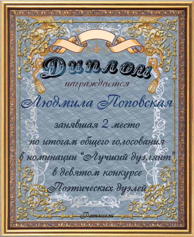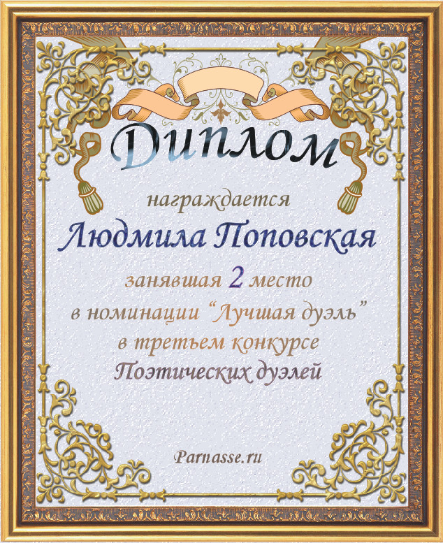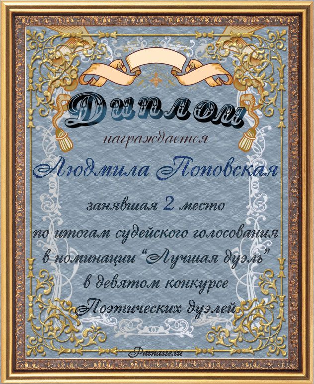 Диплом за 2-е место в номинации "Лучшая дуэль" по итогам судейского голосования в девятом конкурсе поэтических дуэлей(№ 15.1)