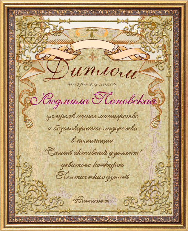 Диплом присуждён в номинации "Самый активный дуэлянт" девятого конкурса поэтических дуэлей