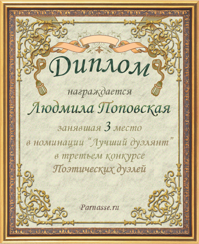 Диплом за второе место в номинации "Лучшая дуэль" в третьем конкурсе Поэтических дуэлей