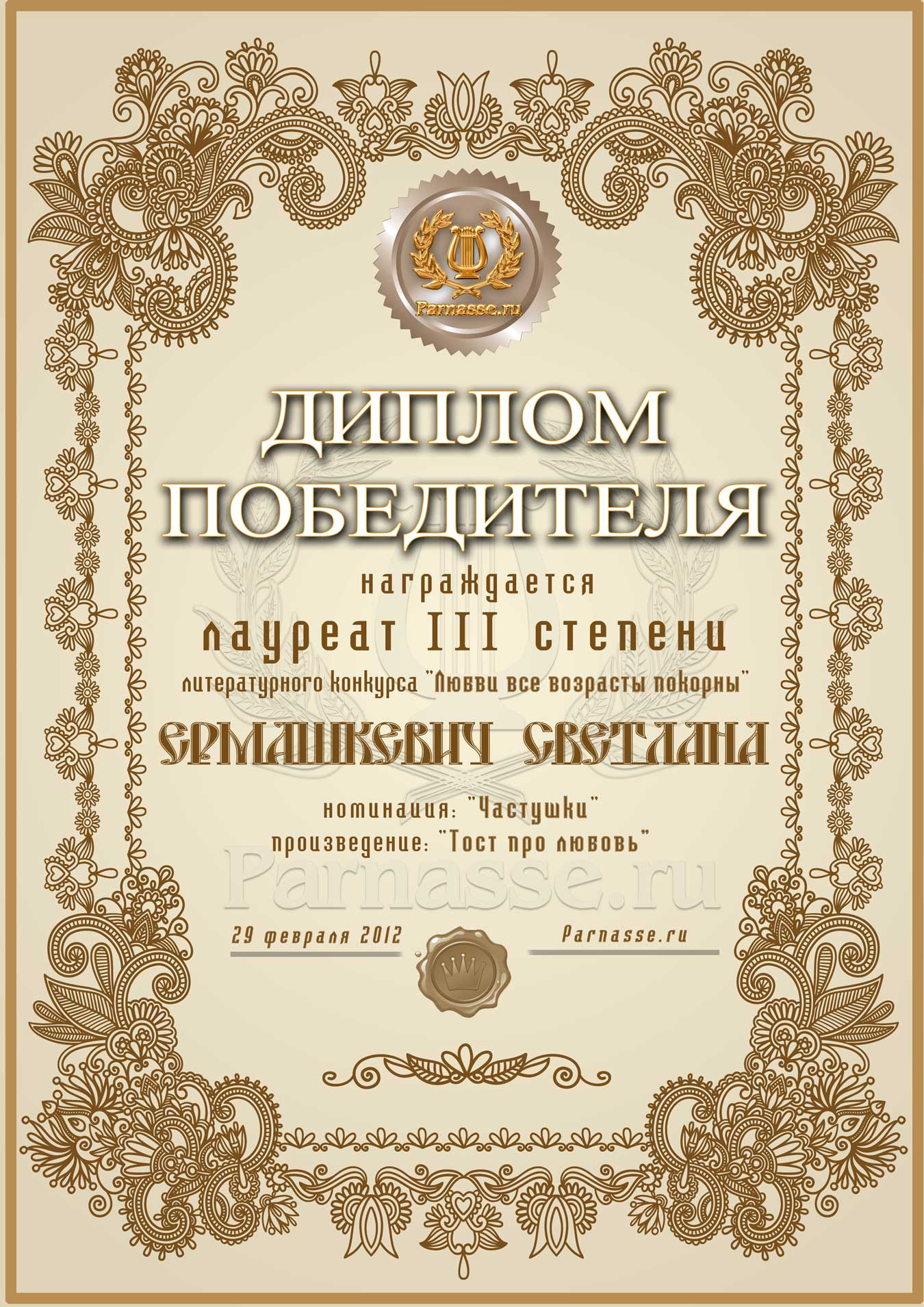 Диплом лауреата III степени лит.конкурса "Любви все возрасты покорны"
