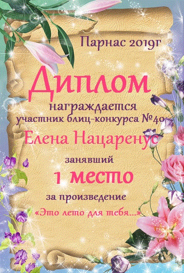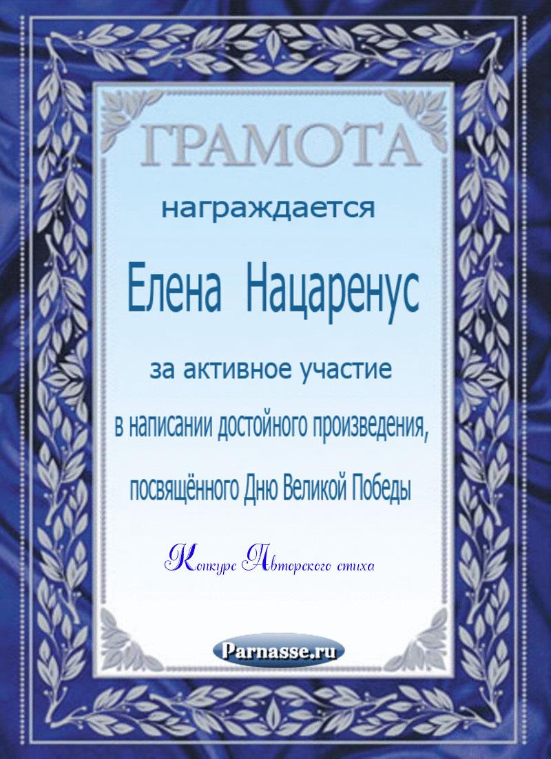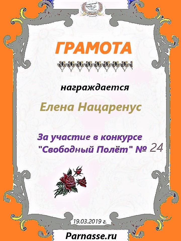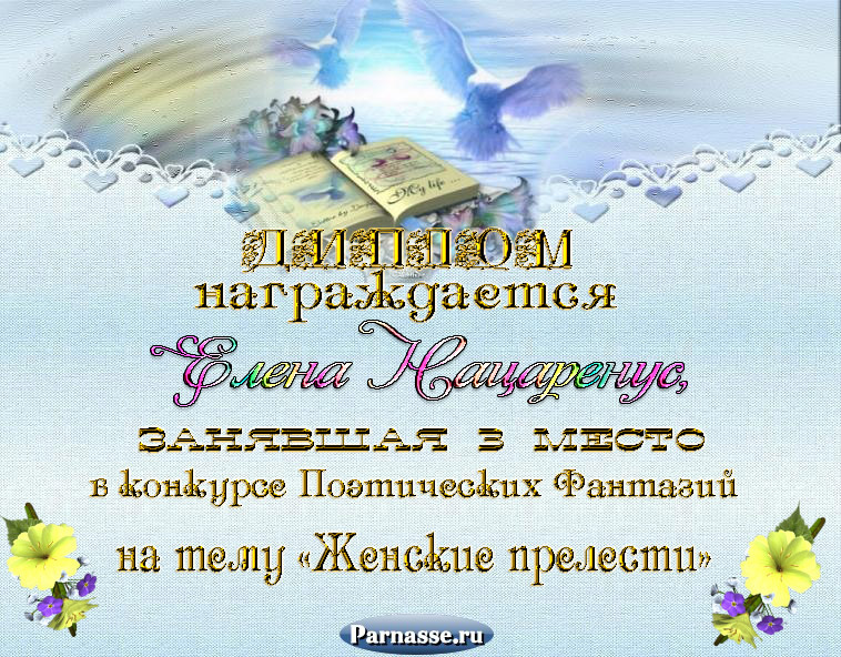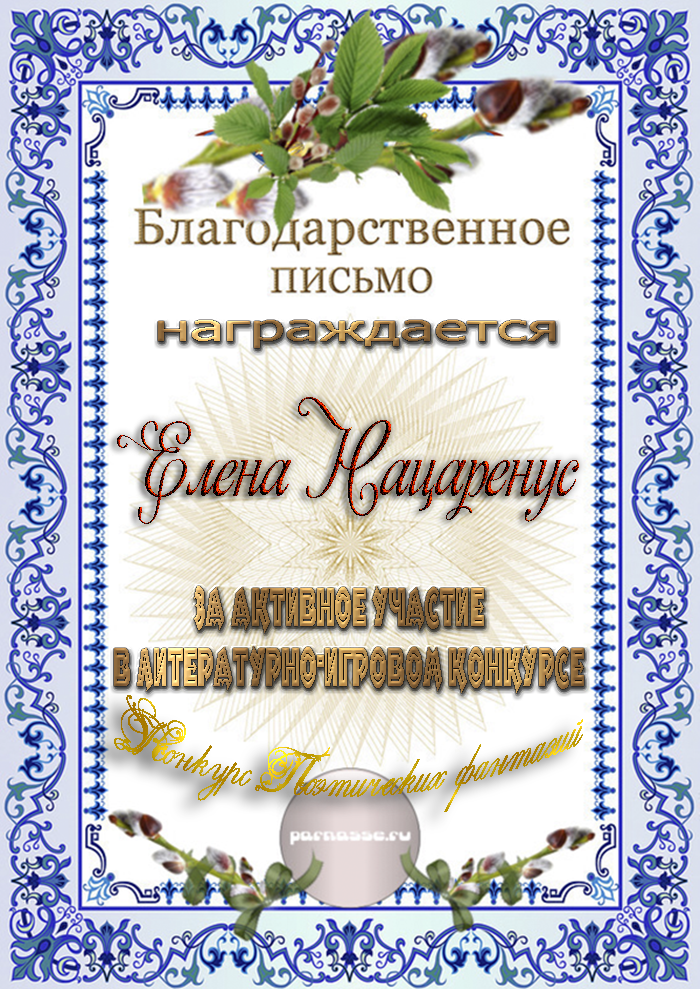 За неугасающую и неисчерпаемую творческую активность, постоянный контакт с Музой и признание сообществом "Парнасцев".От всей души желаем Вам, Елена, здоровья, любви, успехов, благополучия, удачи и творческого вдохновения!
