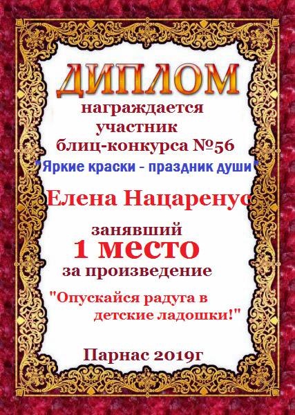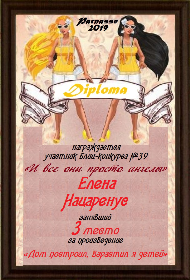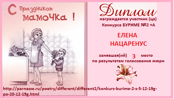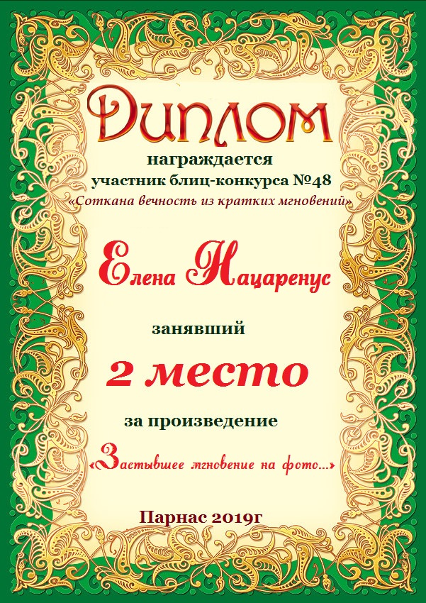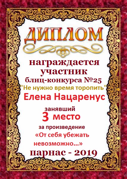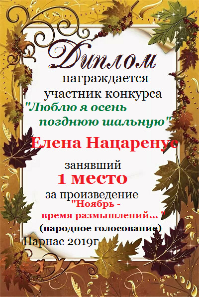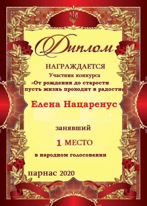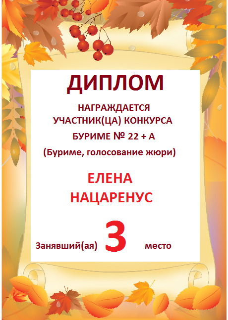 Диплом за 3 место в конкурсе авторского стиха №2 под названием "У каждого есть в жизни Берег Детства".ПОЗДРАВЛЯЕМ!