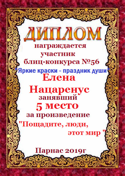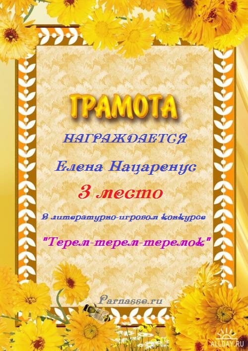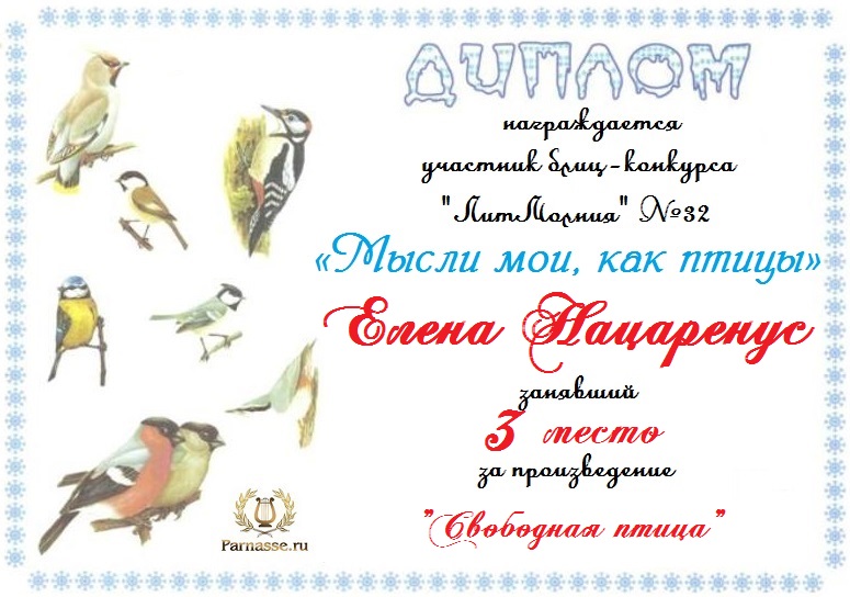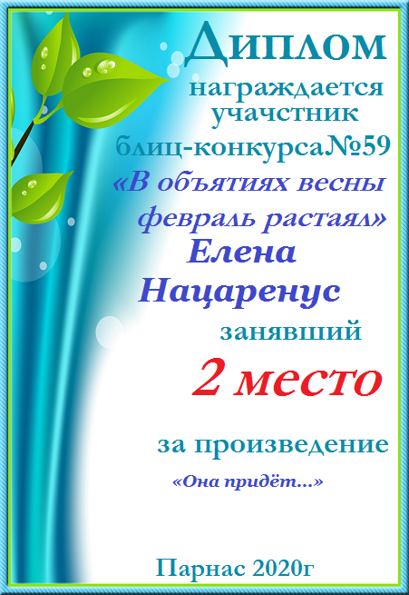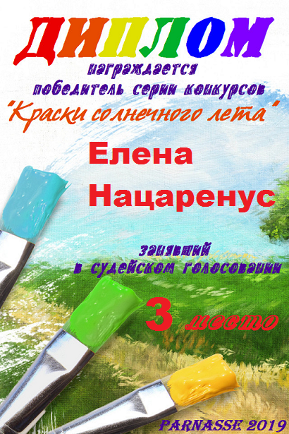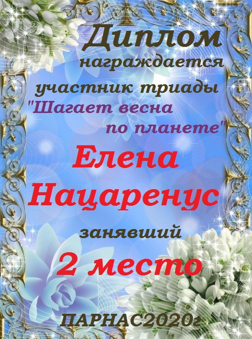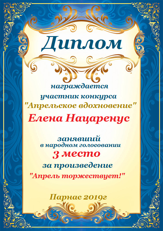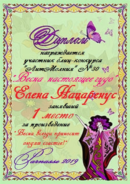 Третье место в конкурсе "Последнее послание зимы" в поэтической номинации, судейское голосование. Поздравляем с прекрасной Победой! Примите от нас искренние пожелания мира и добра, солнца, тепла и света! Улыбок друзей и заботы родных!