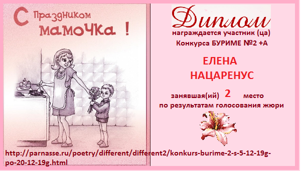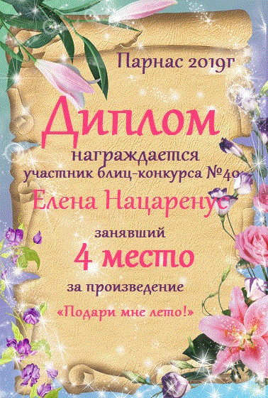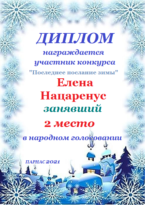 За яркое участие в конкурсе "Последнее послание зимы". Спасибо за прекрасный конкурсный стих. Желаем отличного настроения, вдохновения и ждём с нетерпением Ваши чудесные стихотворения в новых конкурсах!