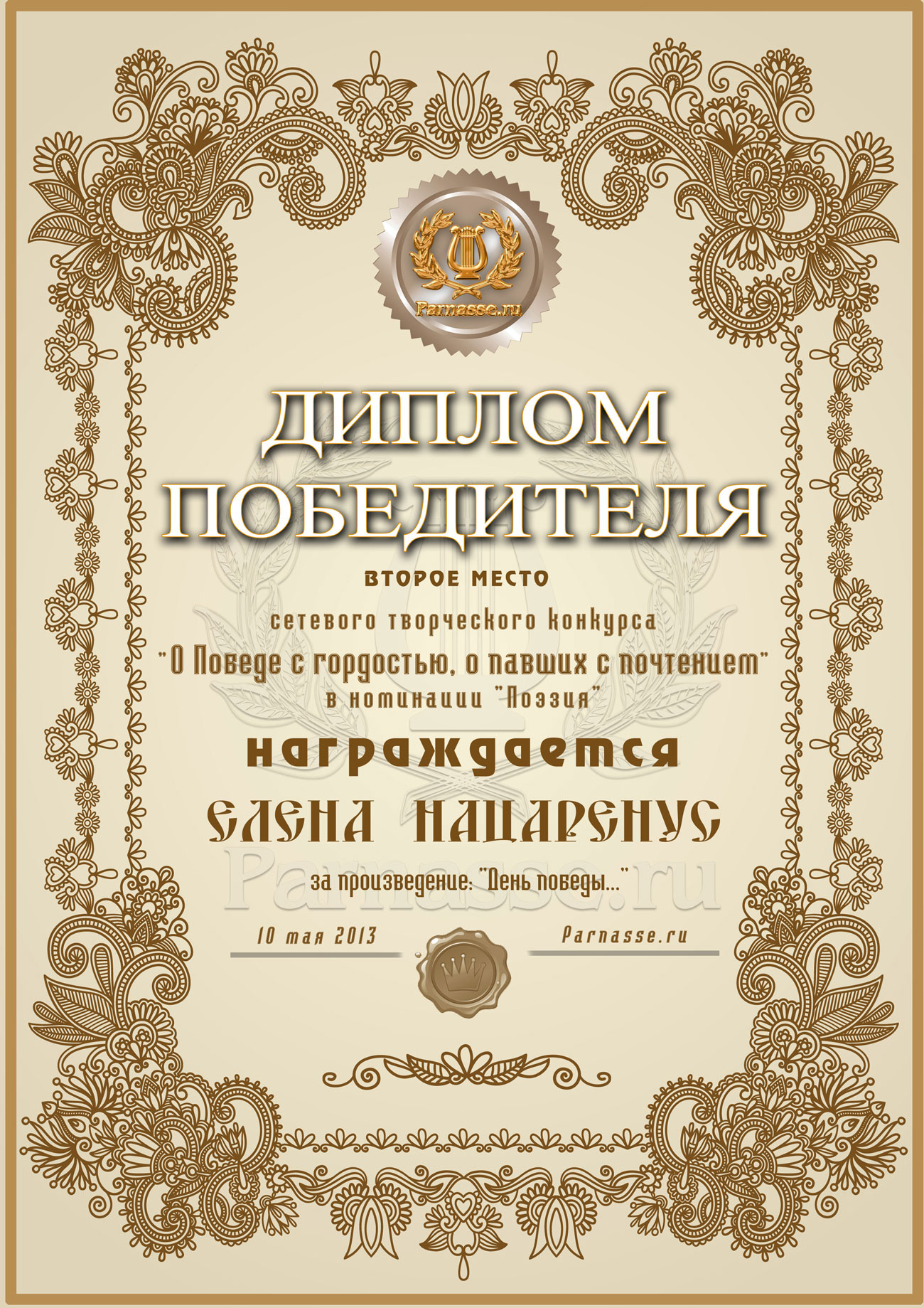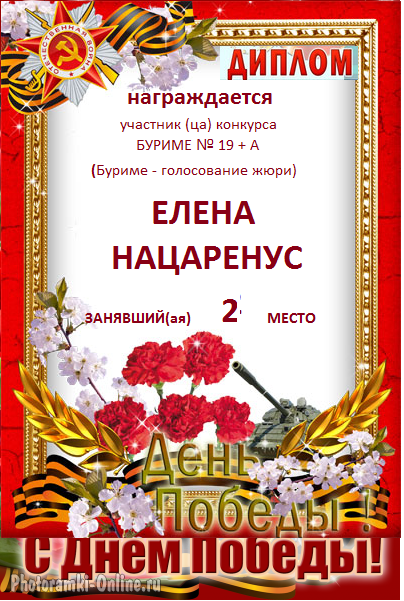 Второе место в конкурсе "О Победе с гордостью, о павших с почтением" (По оценке судей. За произведение "День Победы")