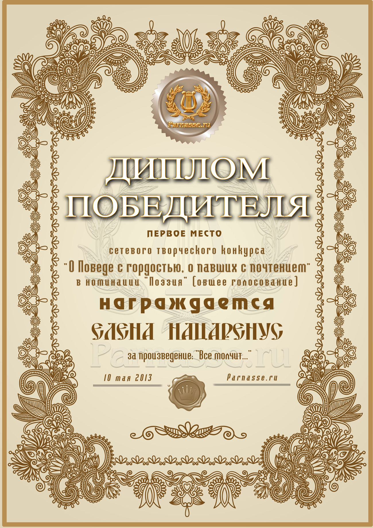 Первое место в конкурсе "О Победе с гордостью, о павших с почтением" (Общее голосование. За произведение "Всё молчит..")