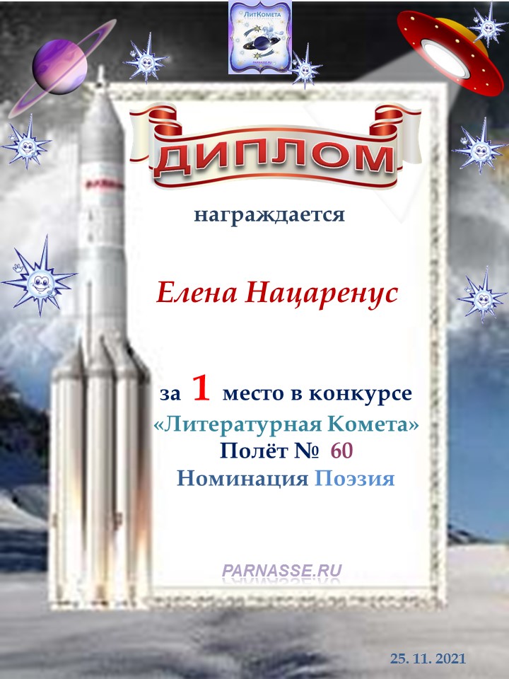Поздравляю с занятым 1 местом в конкурсе "Литературная Комета - Полёт № 60" в Номинации Поэзия!