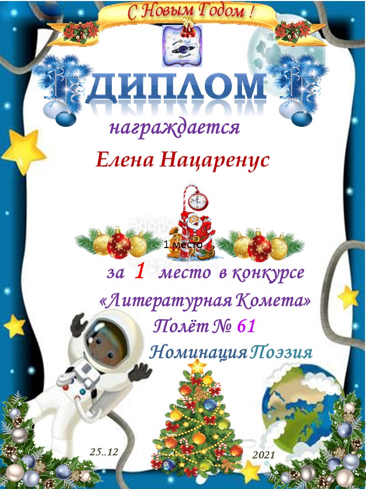 Поздравляю с занятым 1 местом в конкурсе "Литературная Комета - Полёт № 54" - Номинация Поэзия!