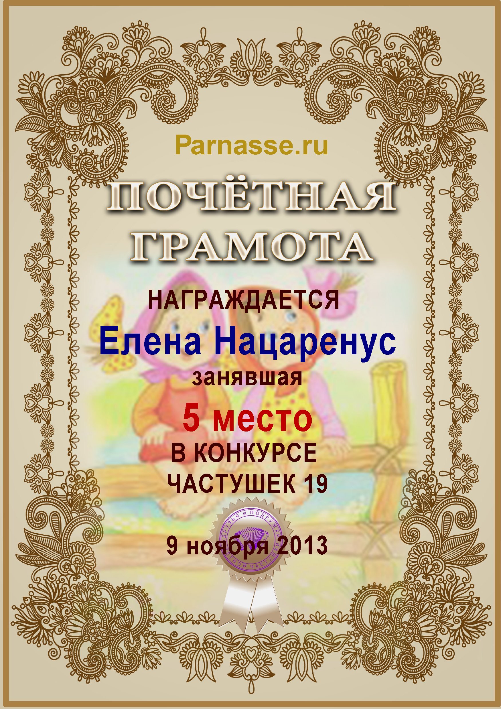 ЕЛЕНА, ПОЗДРАВЛЯЮ ВАС С ПОЧЕТНЫМ 5 МЕСТОМ В КОНКУРСЕ ЧАСТУШЕК №9++