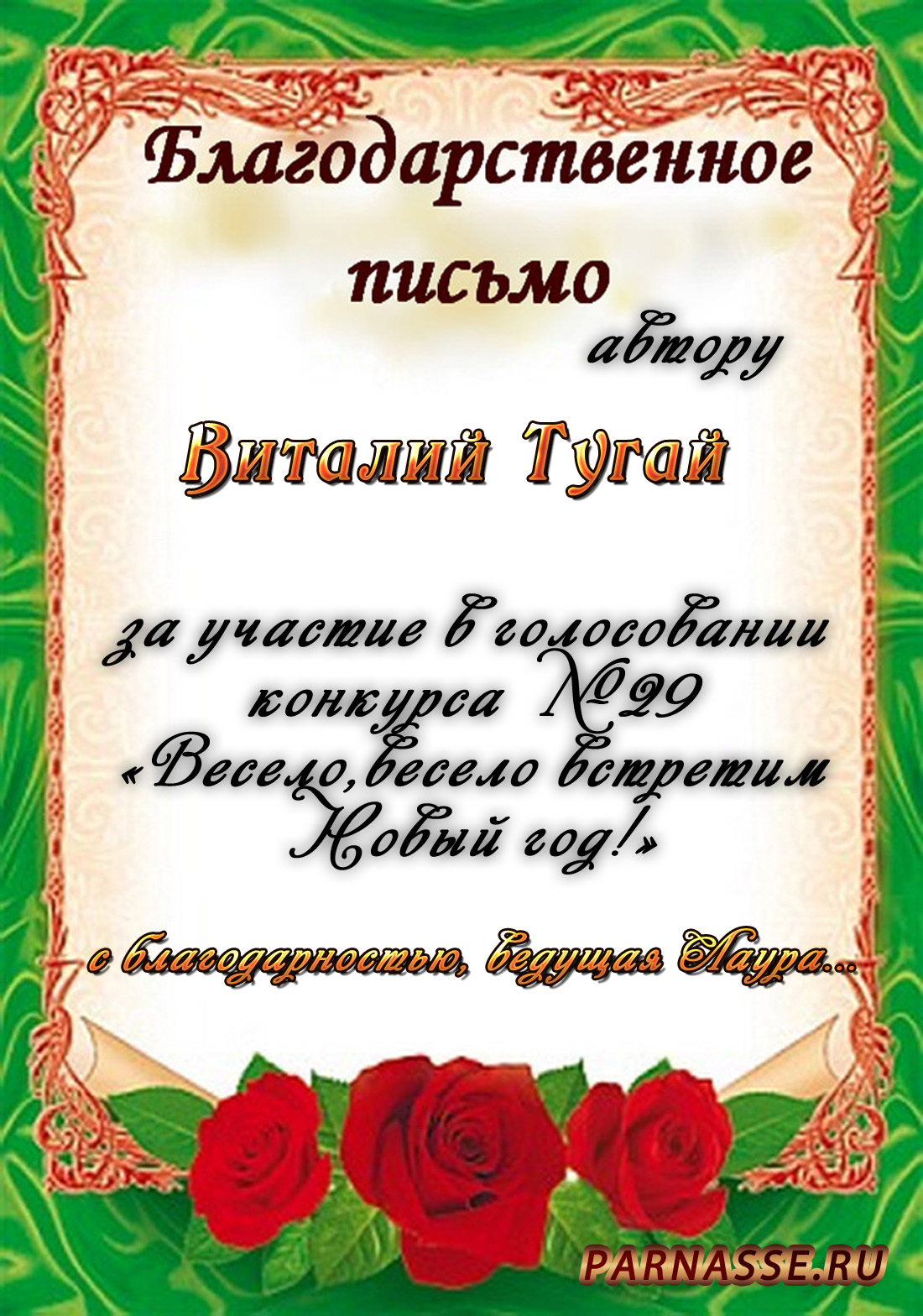 От лица Администрации творческого портала "Парнас" вручаем Вам этот памятный знак с самыми наилучшими пожеланиями! Пусть Вас весь год не покидает творческий запал, удача, а здоровье будет столь же крепким и нерушимым, как и традиция Новогоднего праздника! Счастья, успехов и любви Вам и Вашей семье, друзьям и близким!
