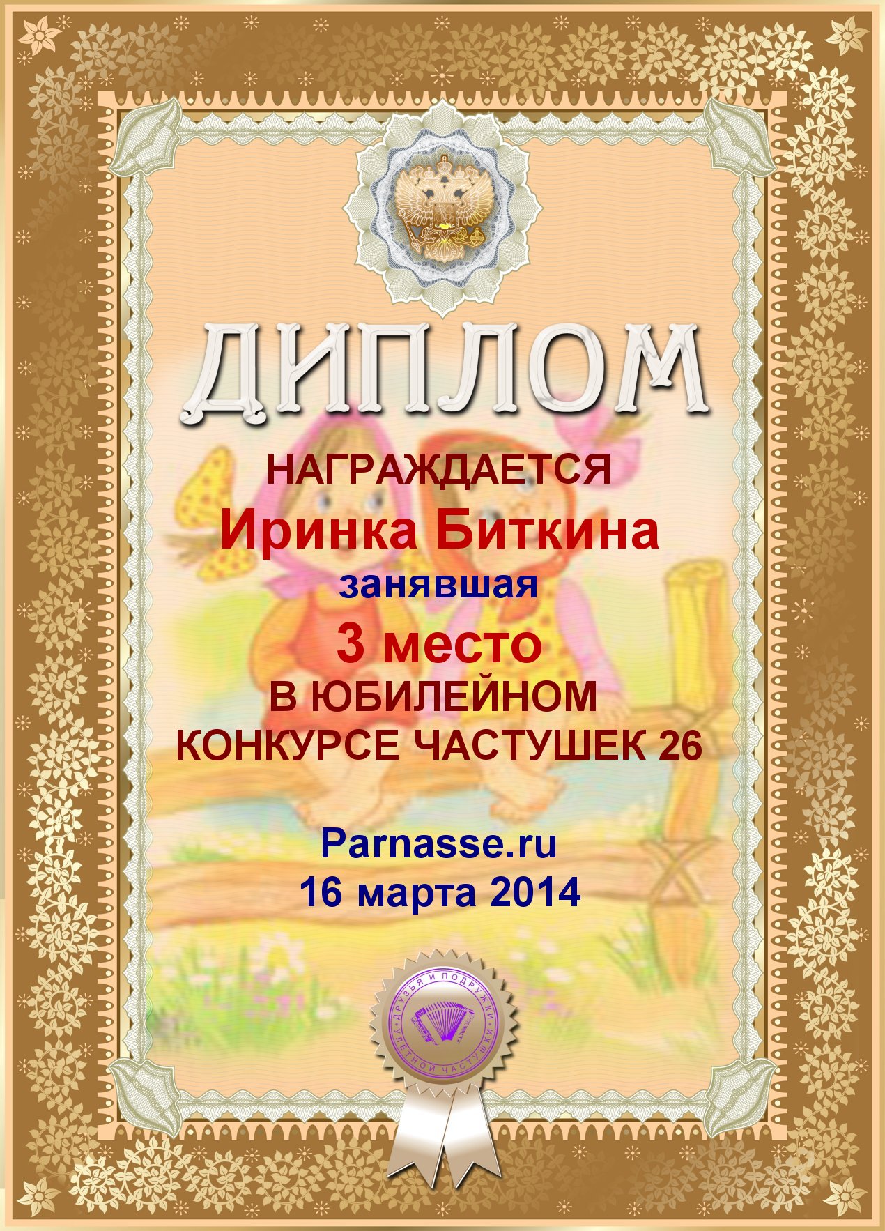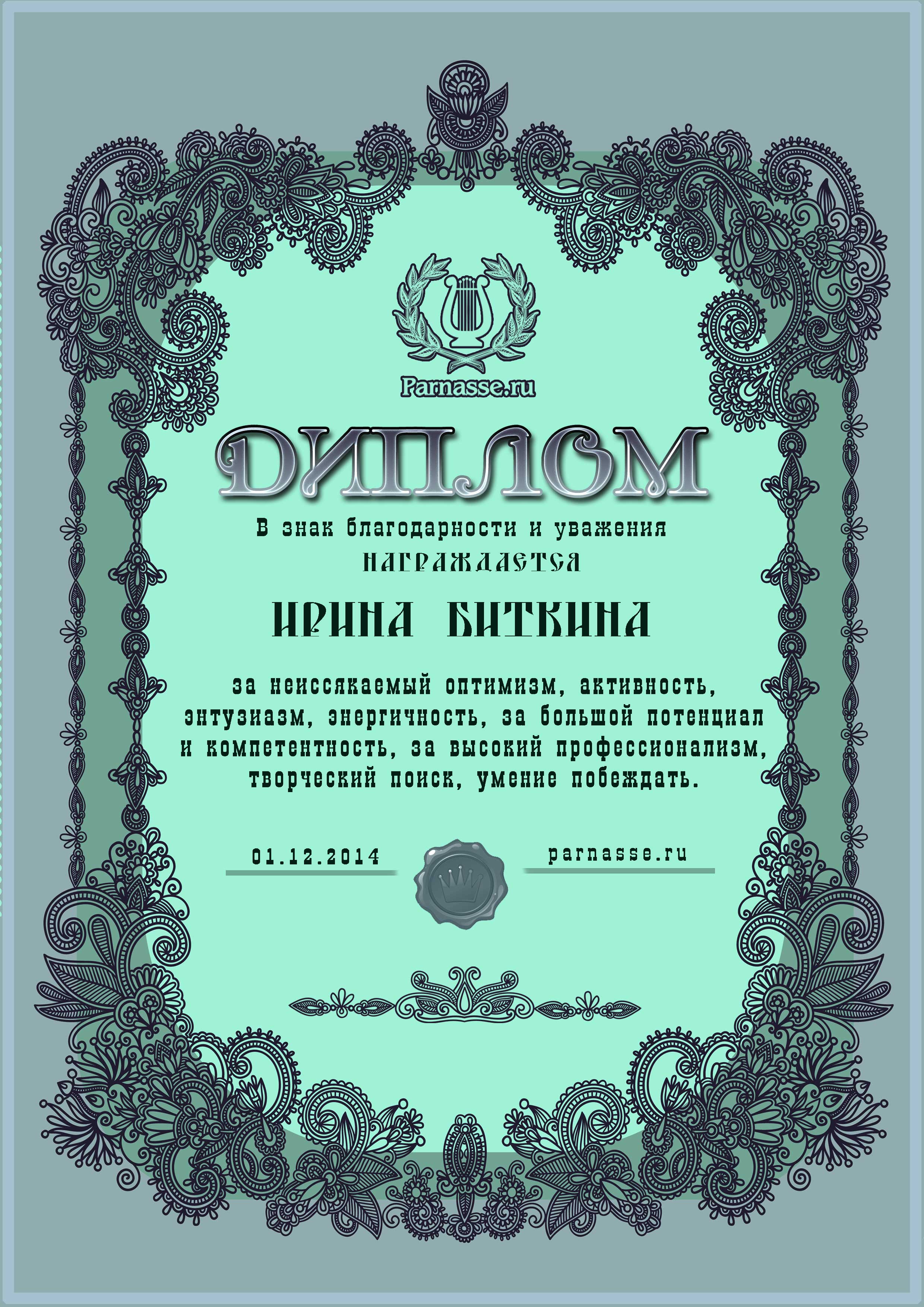 За неугасающую и неисчерпаемую творческую активность, постоянный контакт с Музой и признание сообществом "Парнасцев".От всей души желаем Вам, Иринка, здоровья, любви, успехов, благополучия, удачи и творческого вдохновения!