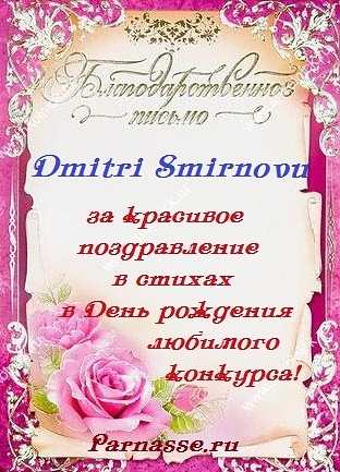 Уважаемый Дмитрий! С Днём Рождения Вас! Счастья, радости, благополучия и бесконечного вдохновения! Всего самого солнечного и радостного! Всех самых больших благ!