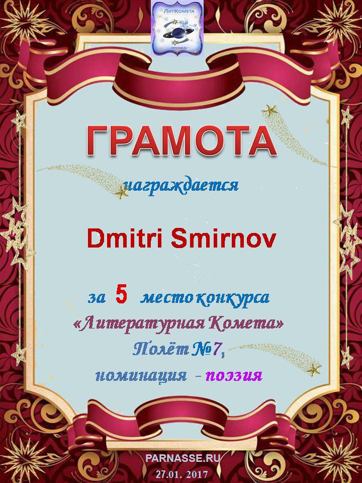 Поздравляю с занятым 5 местом в конкурсе "Литературная Комета - Полёт № 53" - Номинация Поэзия!