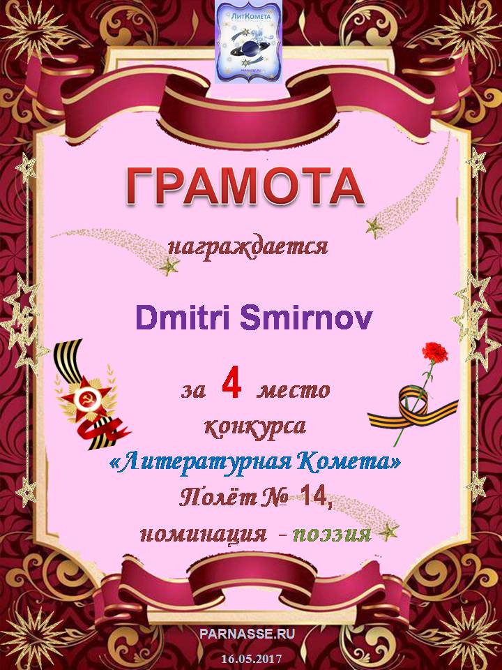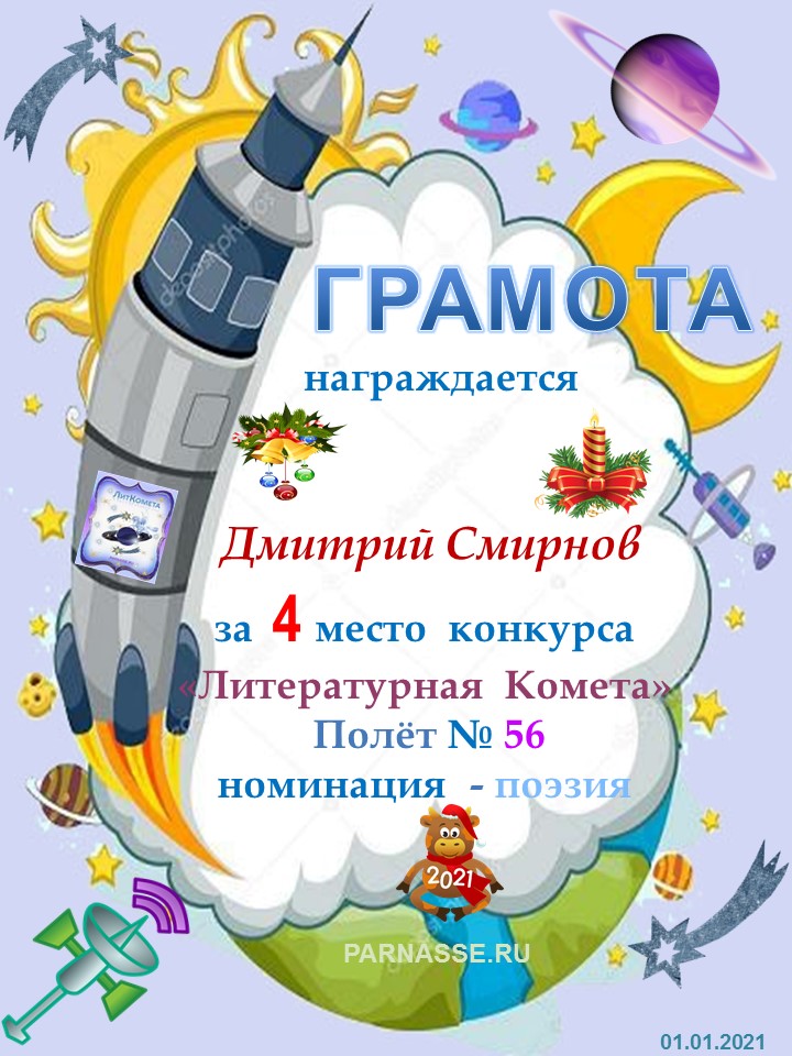 Поздравляю с занятым 4 местом в конкурсе "ЛитКомета - Полёт № 56" - Номинация Поэзия!