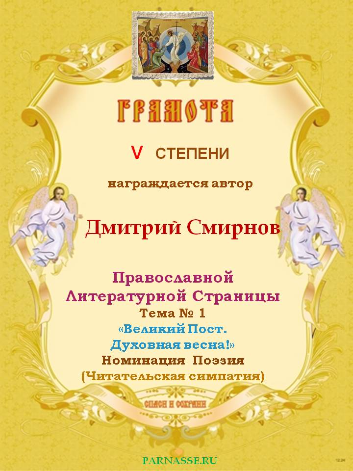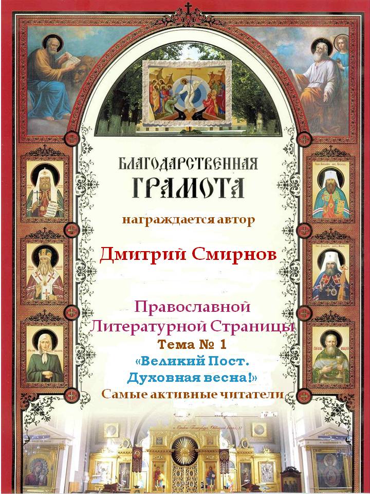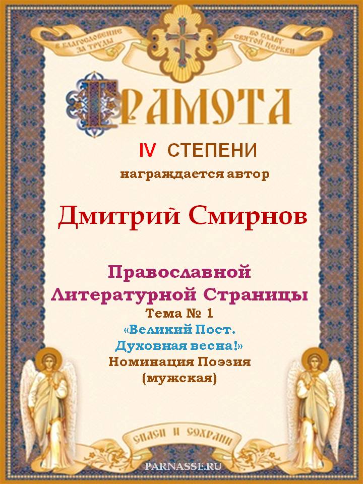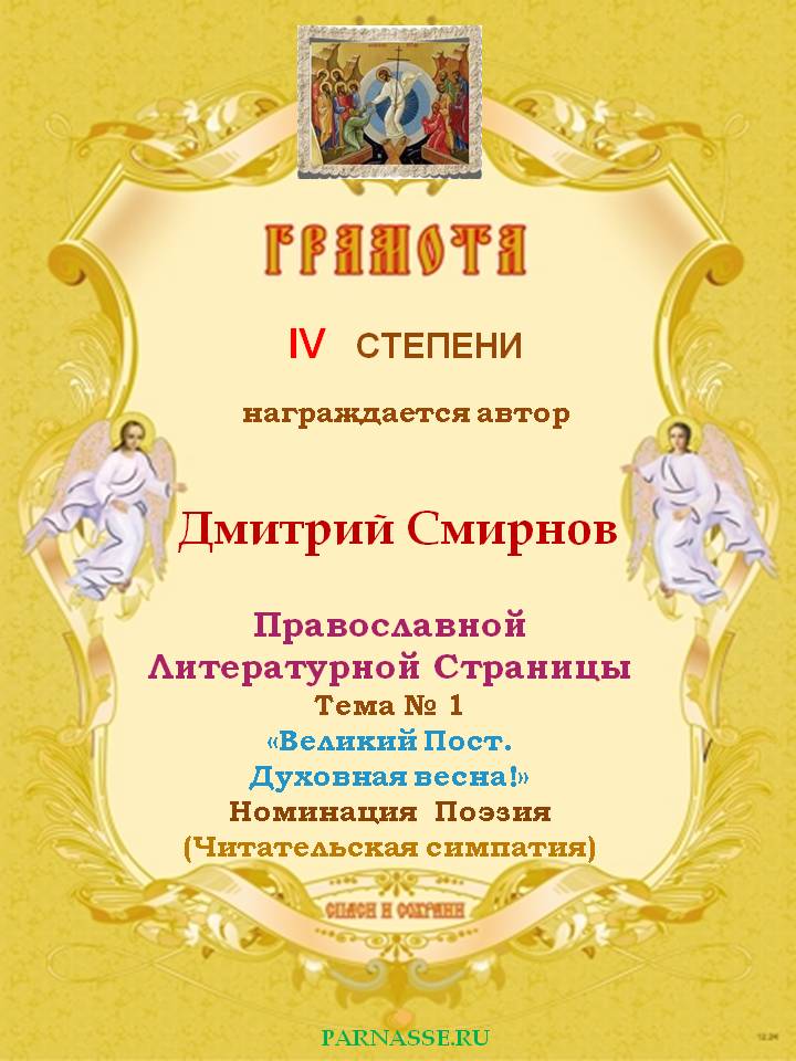 За 4-е место на Православной Литературной Странице, Тема № 1 "Великий Пост. Духовная весна!" Номинация Поэзия.